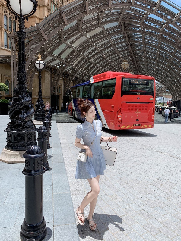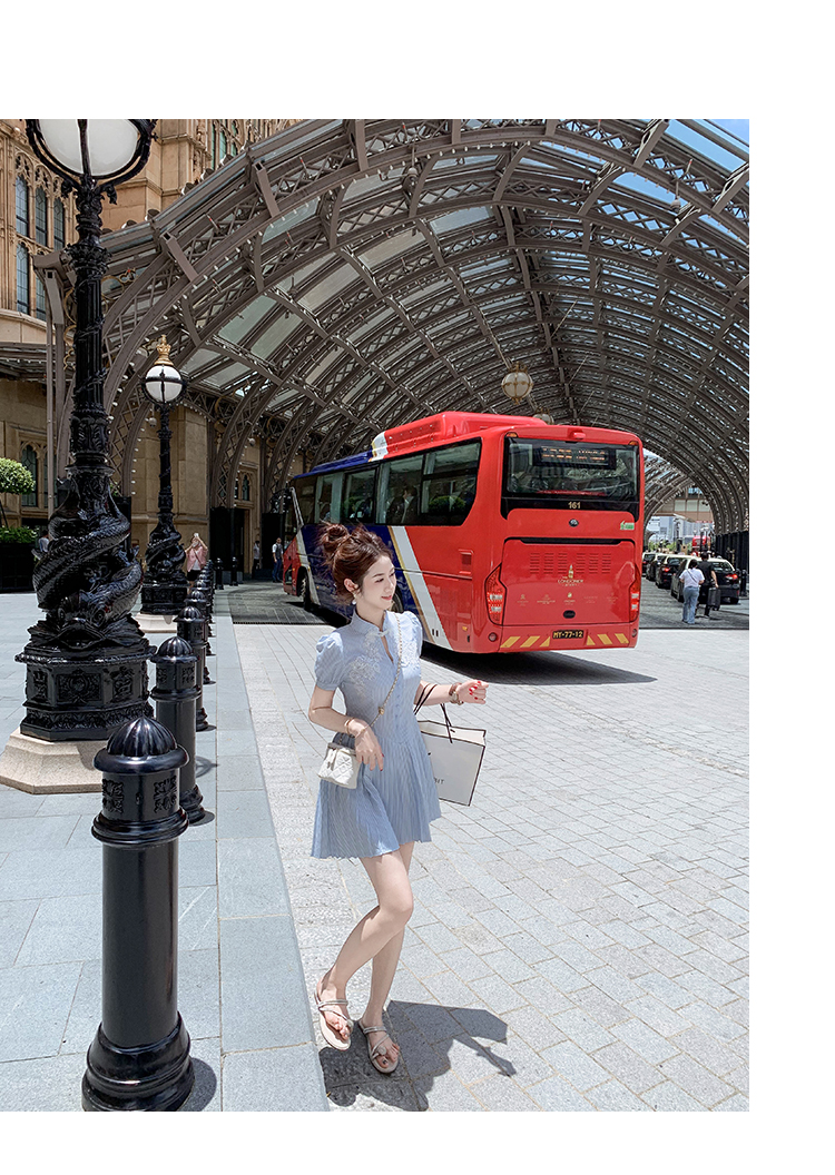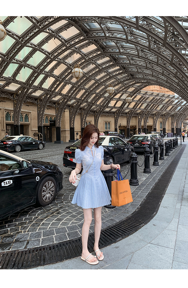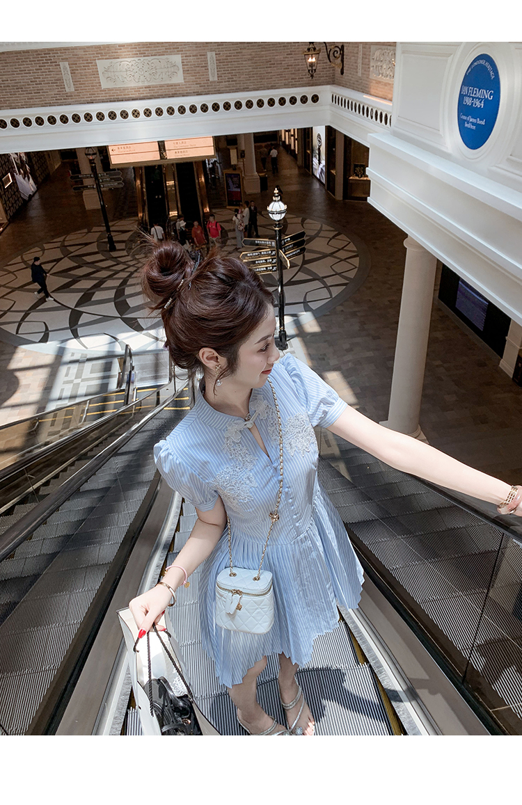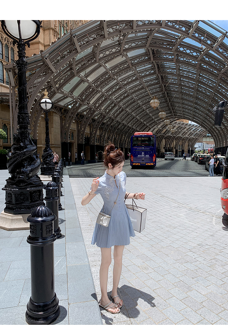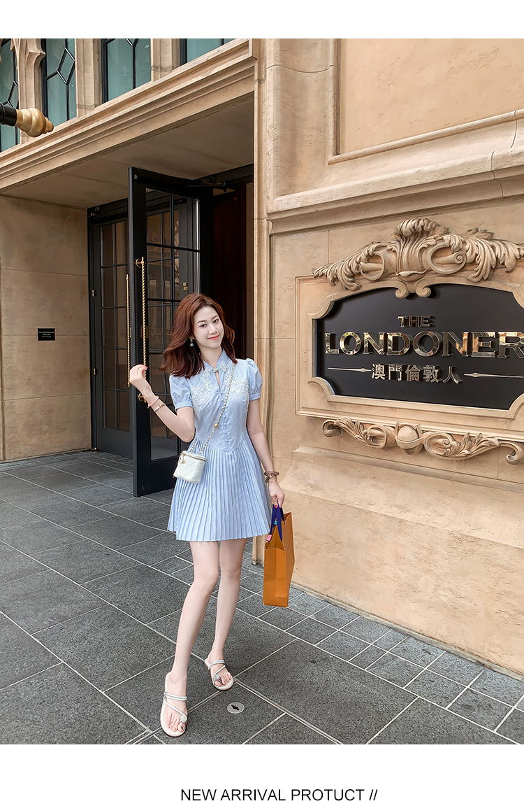 商品名称:新中式蓝色条纹连衣裙女2025夏季新款高级感百褶裙子