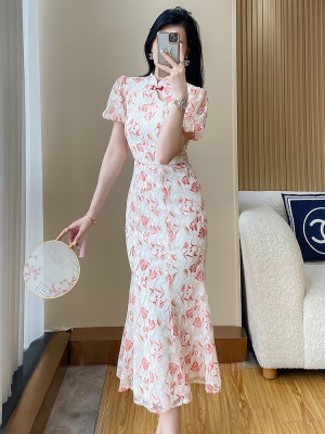 新中式国风汉服旗袍连衣裙女夏气质高级感晚礼服碎花包臀鱼尾裙子