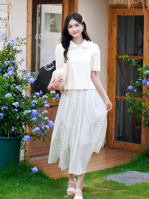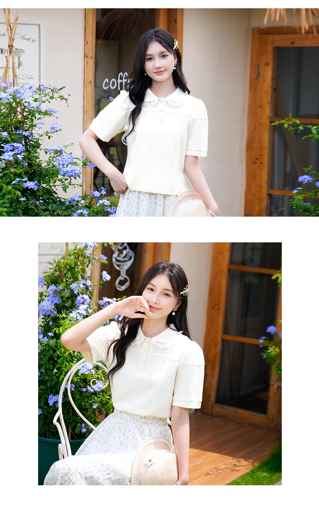 ATAR文艺休闲夏季新品蕾丝花边拼接娃娃领泡泡袖T恤 女短袖POLO衫