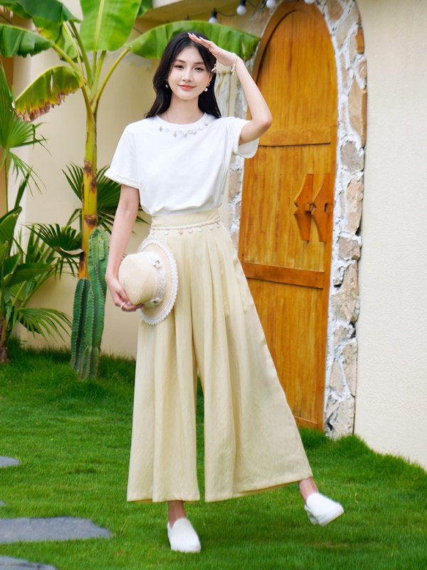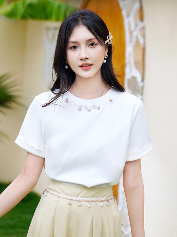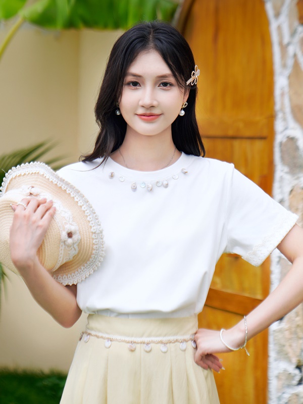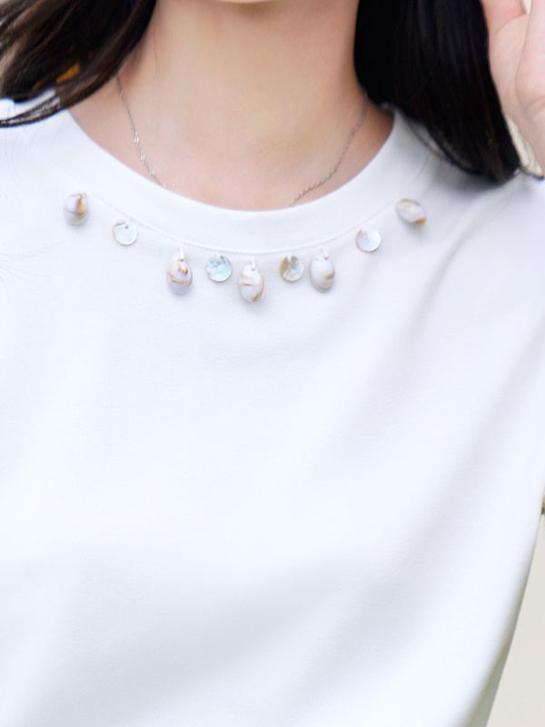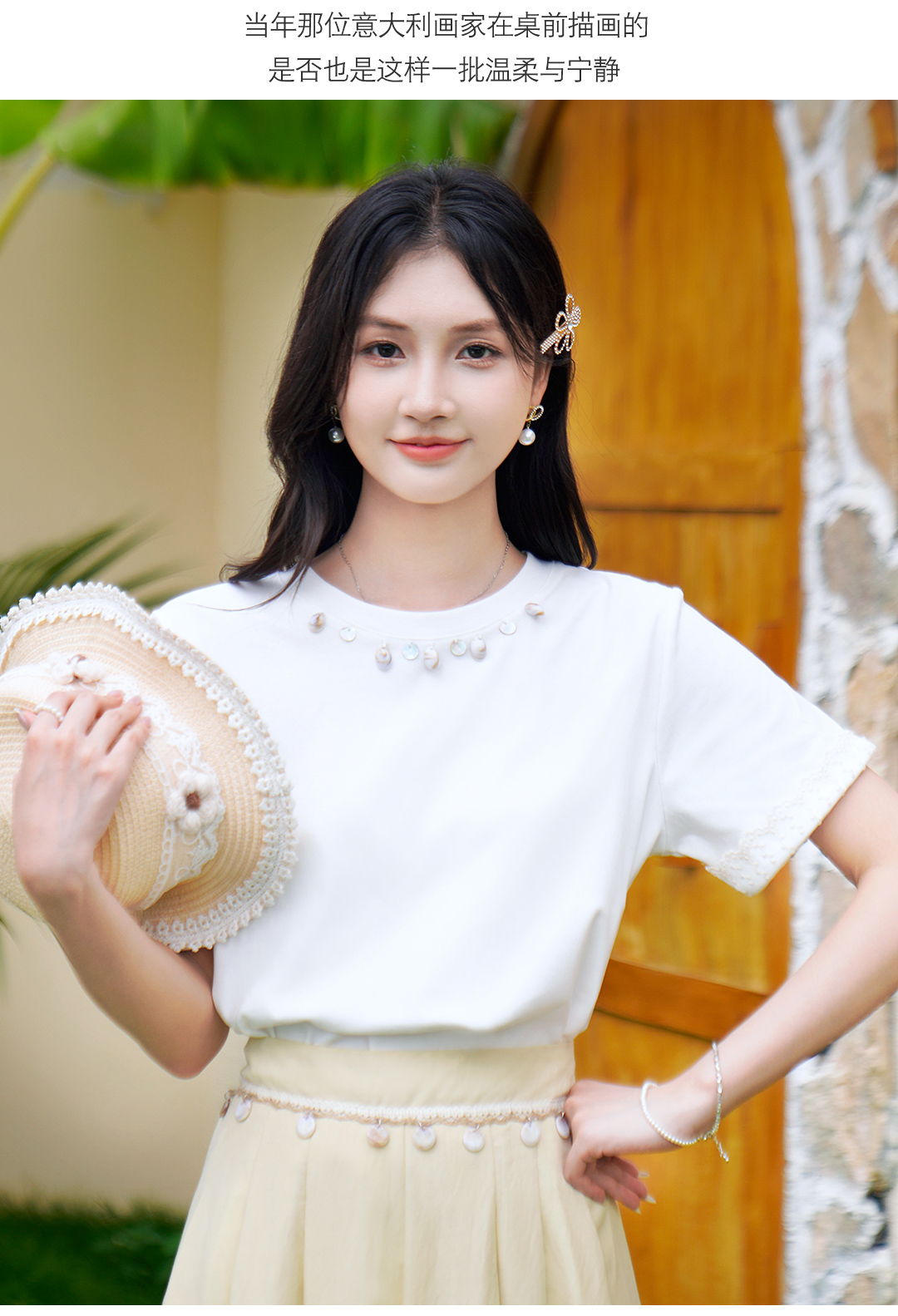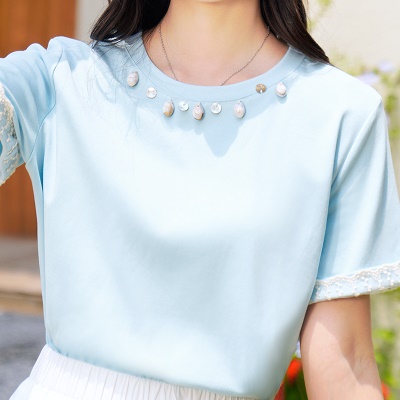 商品名称:ATAR2025夏季新款时尚圆领贝壳T恤拼接蕾丝花边袖口舒适短袖上衣