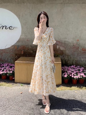 法式碎花雪纺连衣裙子女2025新款夏季v领气质显瘦长裙a字裙超仙女