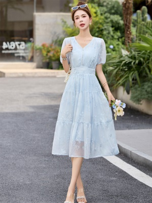 气质钉珠刺绣雪纺连衣裙女2025夏季新款高级感时尚巨好看收腰长裙