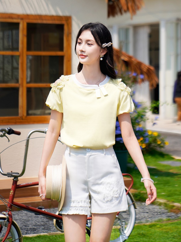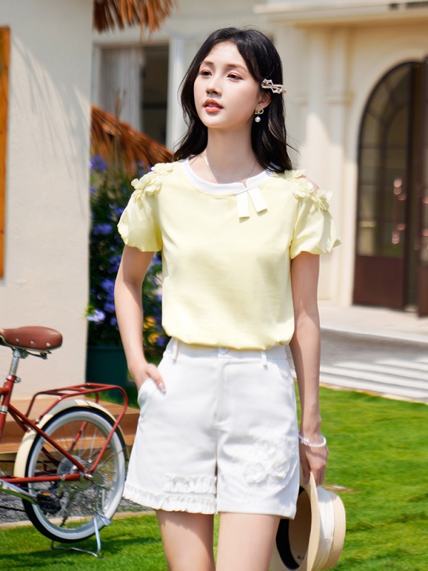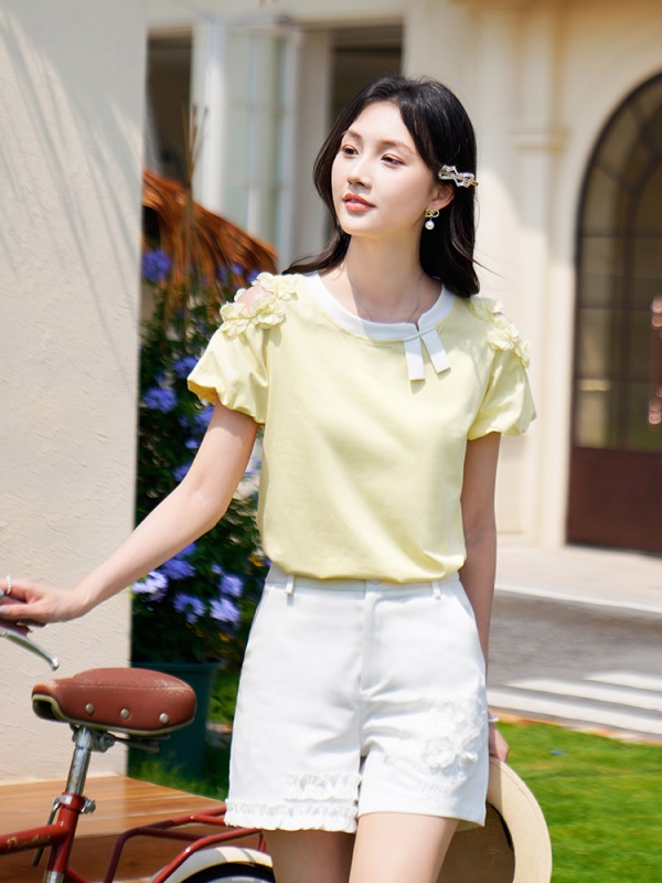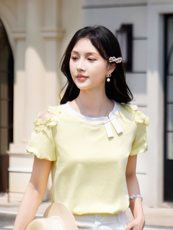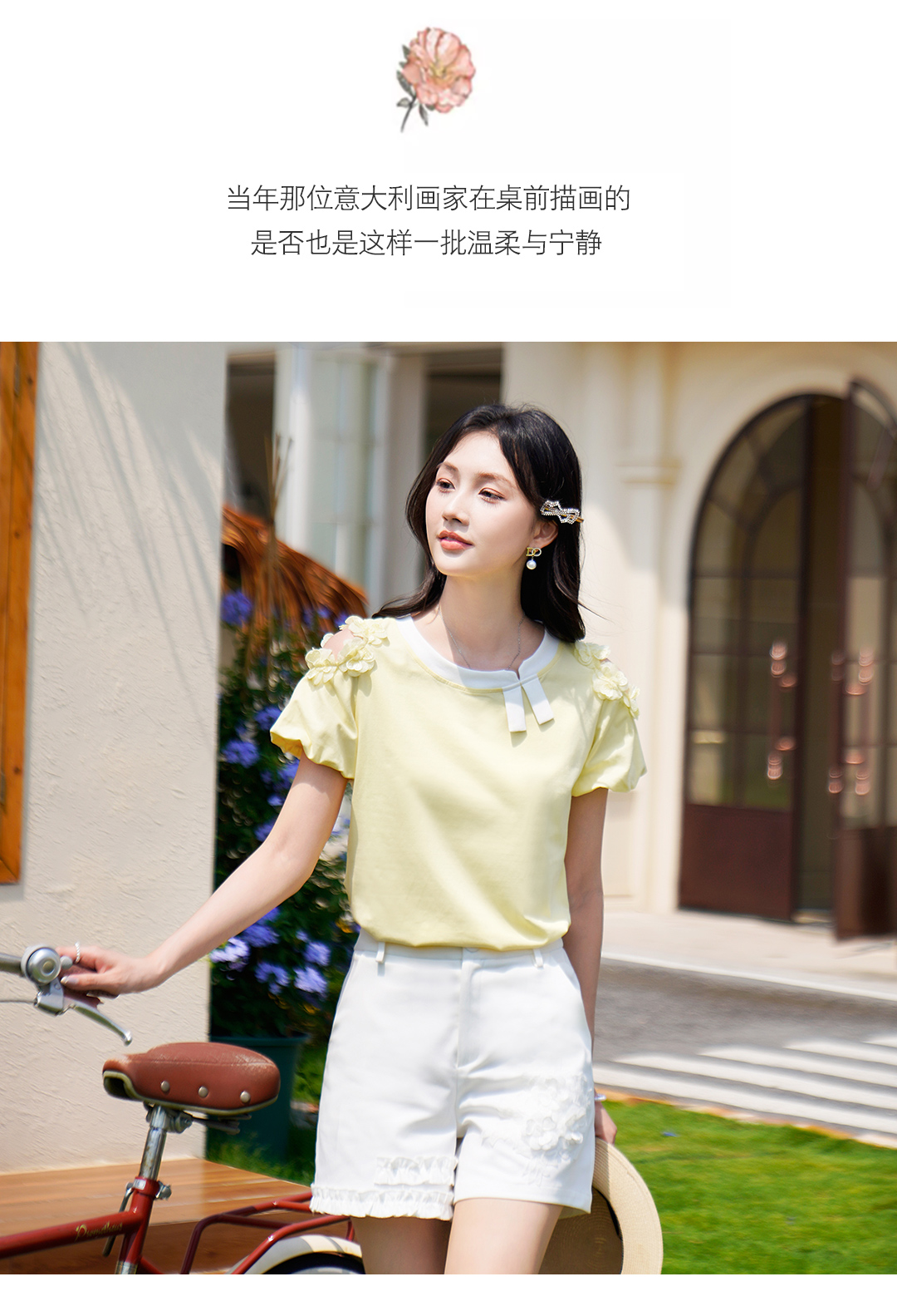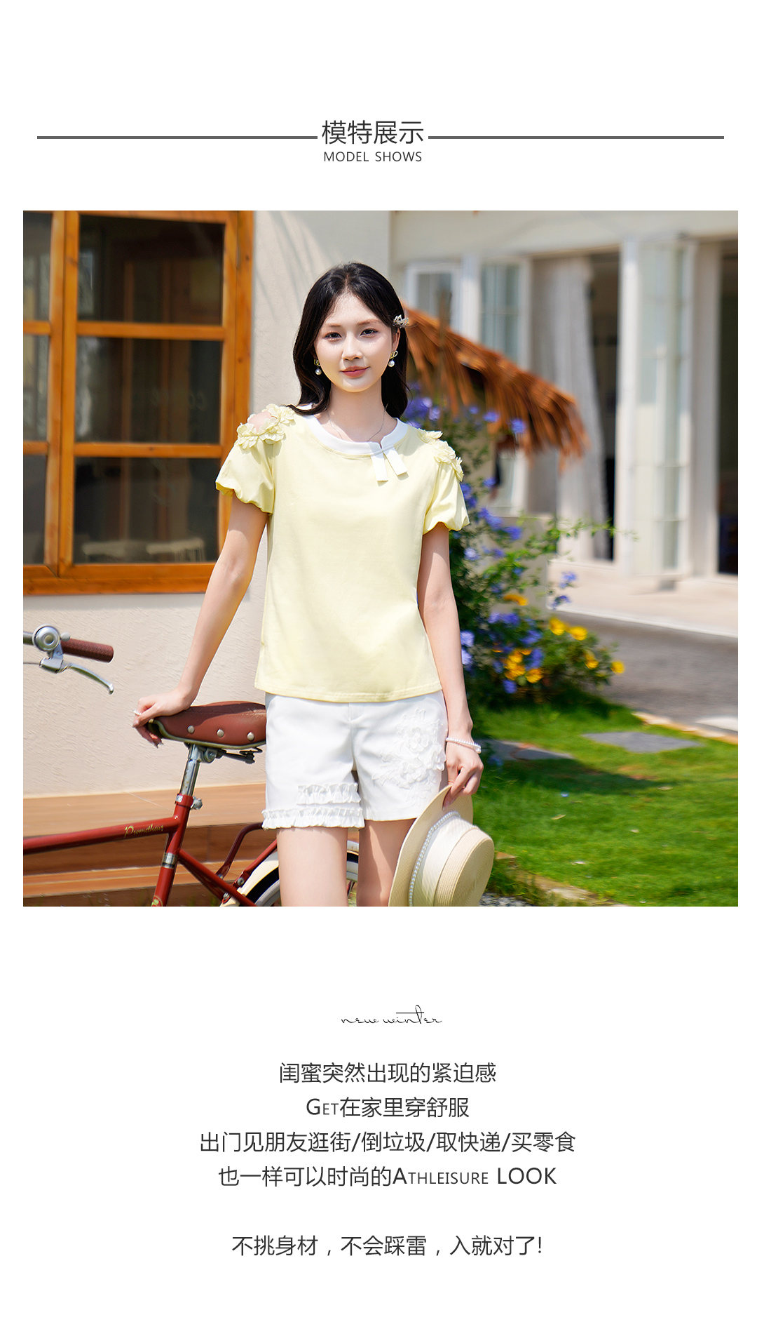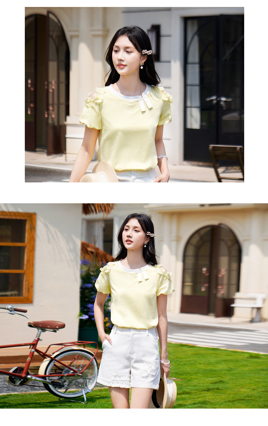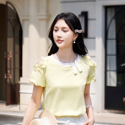 商品名称:ATAR甜美淑女夏装新款立体花瓣袖圆领T恤衫 2025拼色露肩短袖上衣