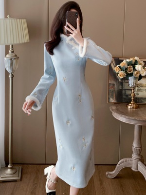新中式国风连衣裙女秋冬新款加绒气质刺绣旗袍改良复古裙子中长款