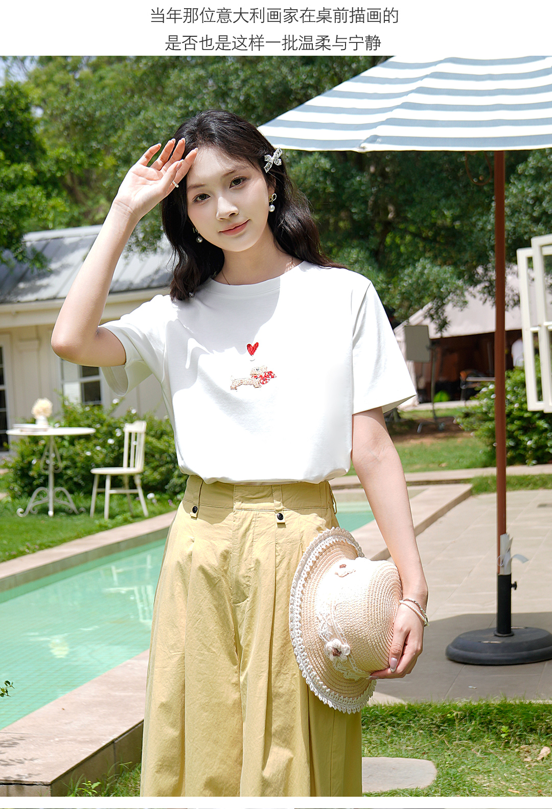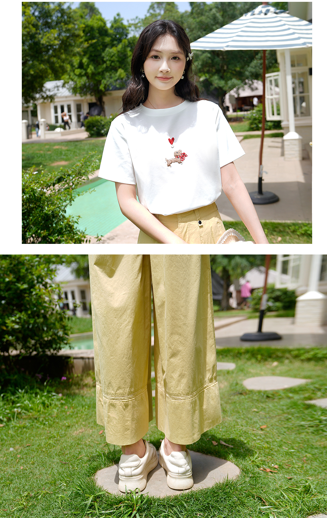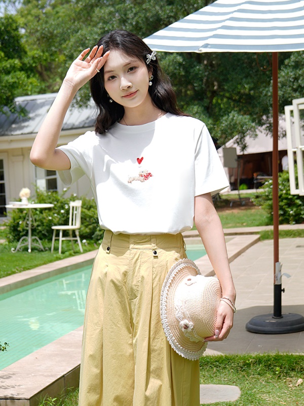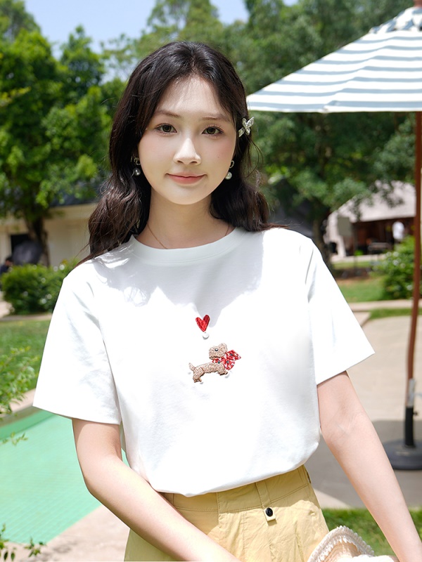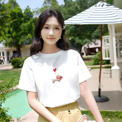 商品名称:ATAR休闲宽松女装刺绣爱心小狗短袖T恤2025夏季新款白色圆领上衣