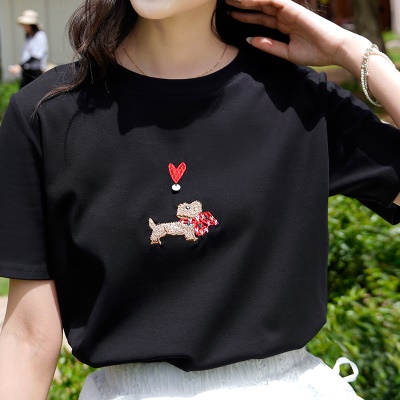 ATAR休闲宽松女装刺绣爱心小狗短袖T恤2025夏季新款白色圆领上衣