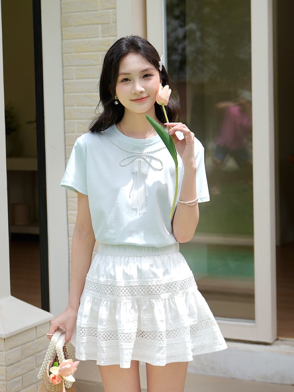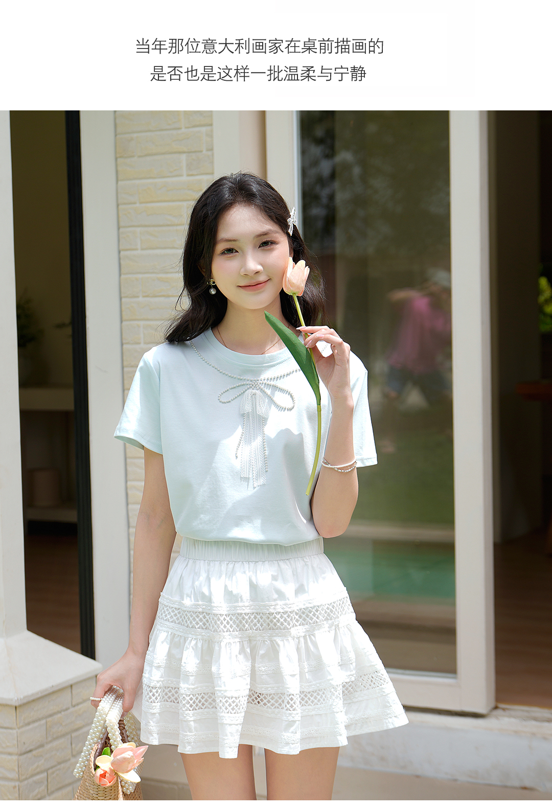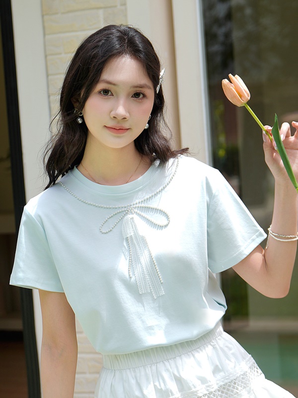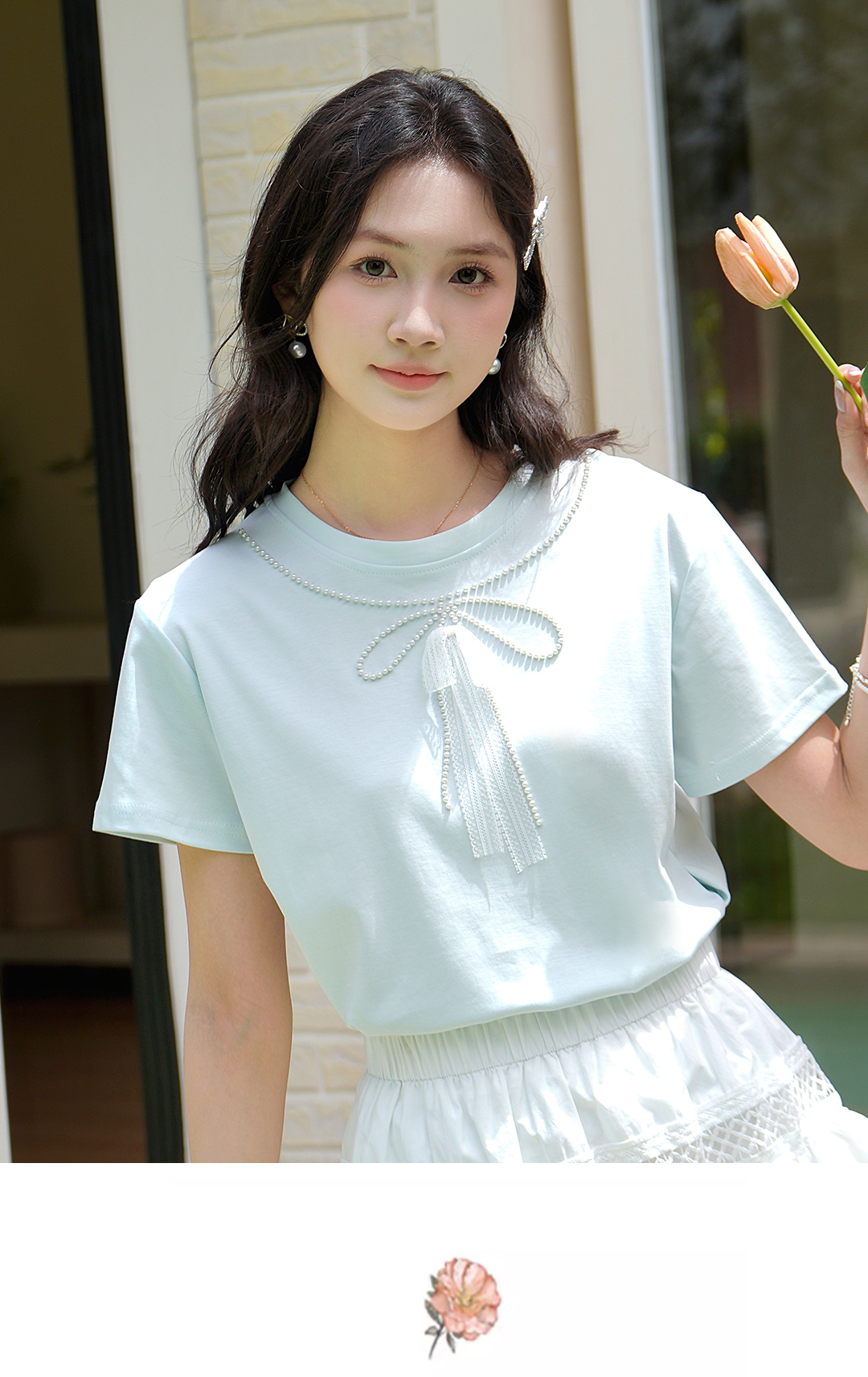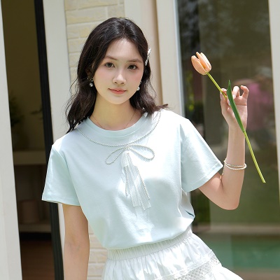 商品名称:ATAR韩版潮流钉珠蝴蝶结短袖T恤 2025夏季新品女宽松体恤休闲上衣