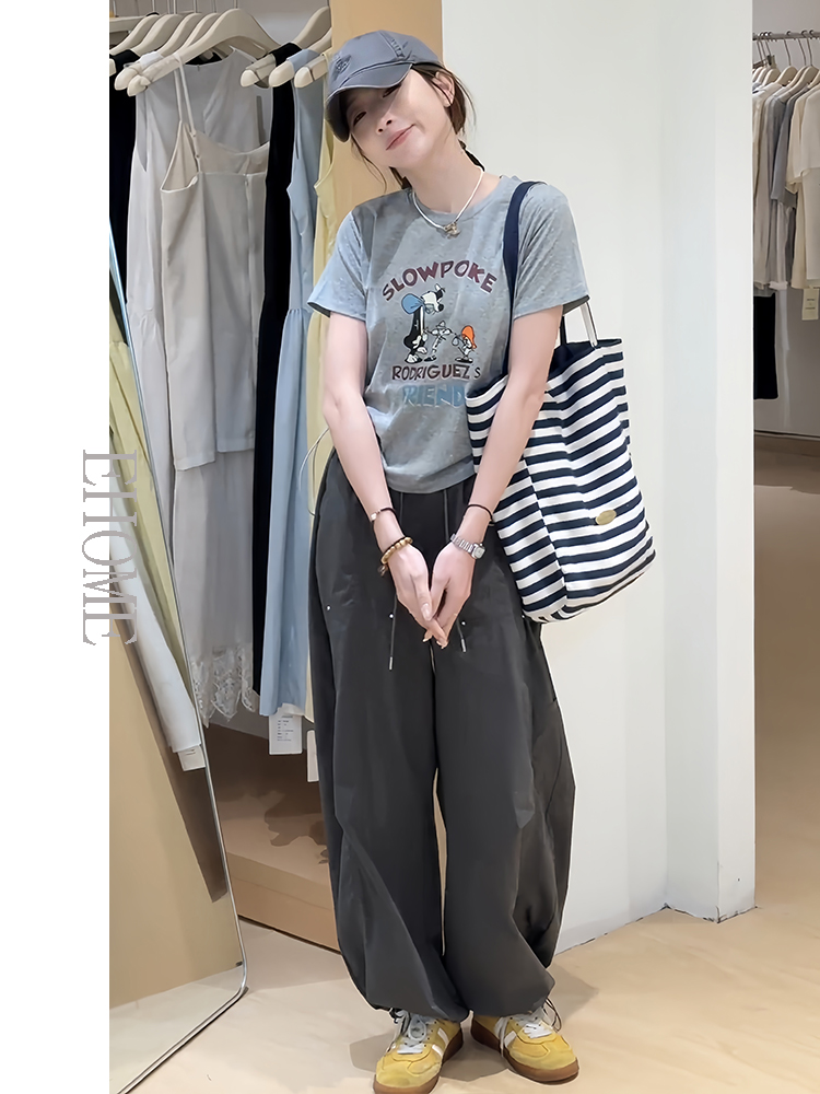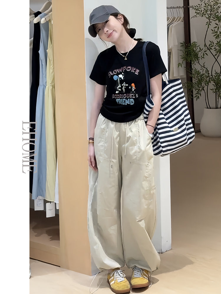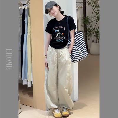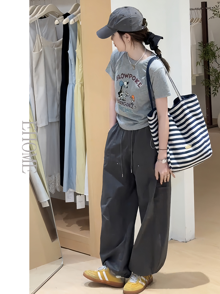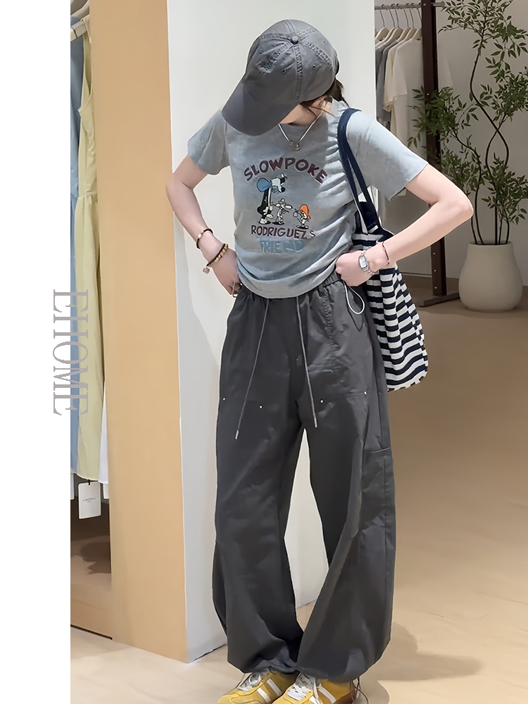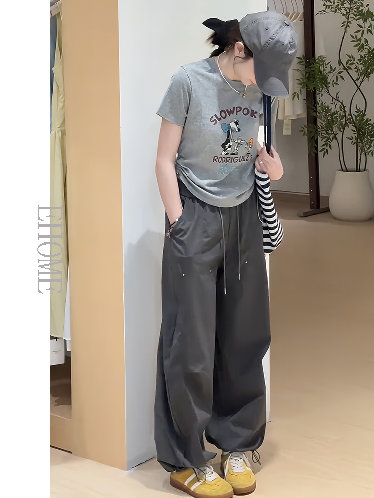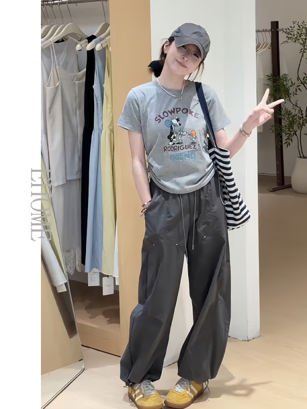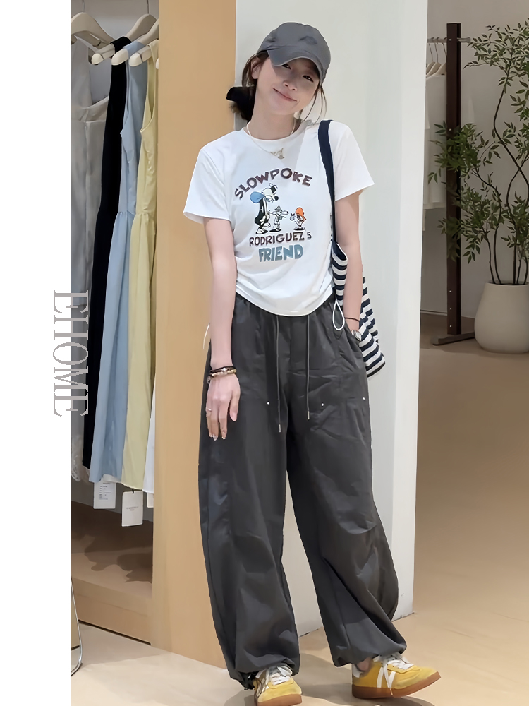 韩系慵懒chic套装卡通老鼠印花侧边抽绳收腰短袖T恤束脚阔腿裤夏