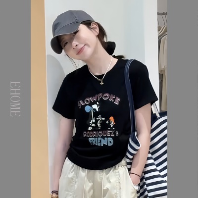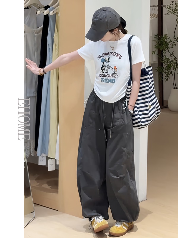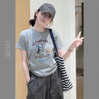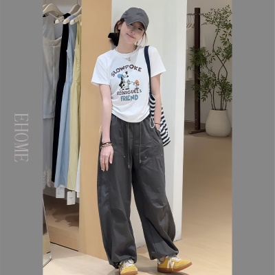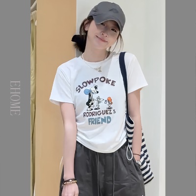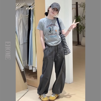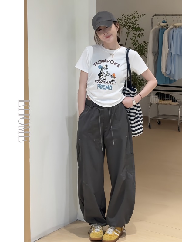 商品名称:韩系慵懒chic套装卡通老鼠印花侧边抽绳收腰短袖T恤束脚阔腿裤夏