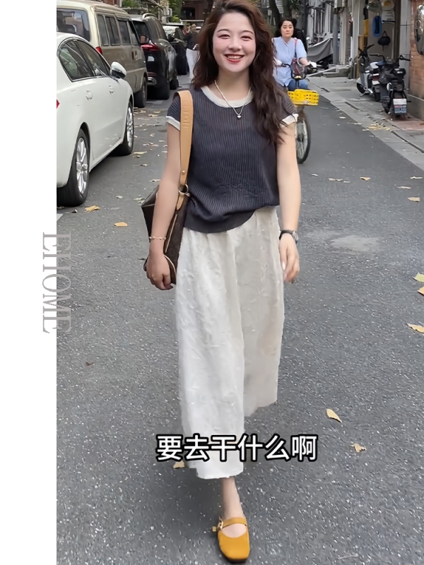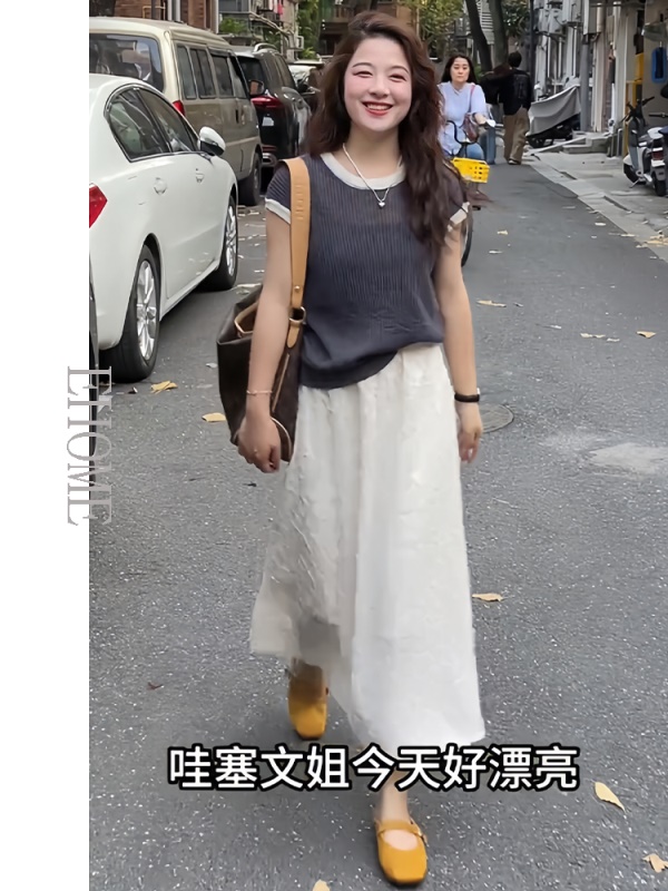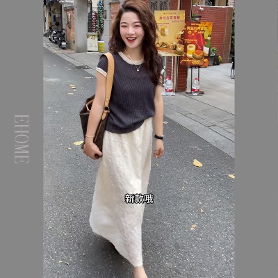 夏日绝美穿搭套装薄款针织冰丝短袖T恤立体蕾丝花朵百搭半身裙女