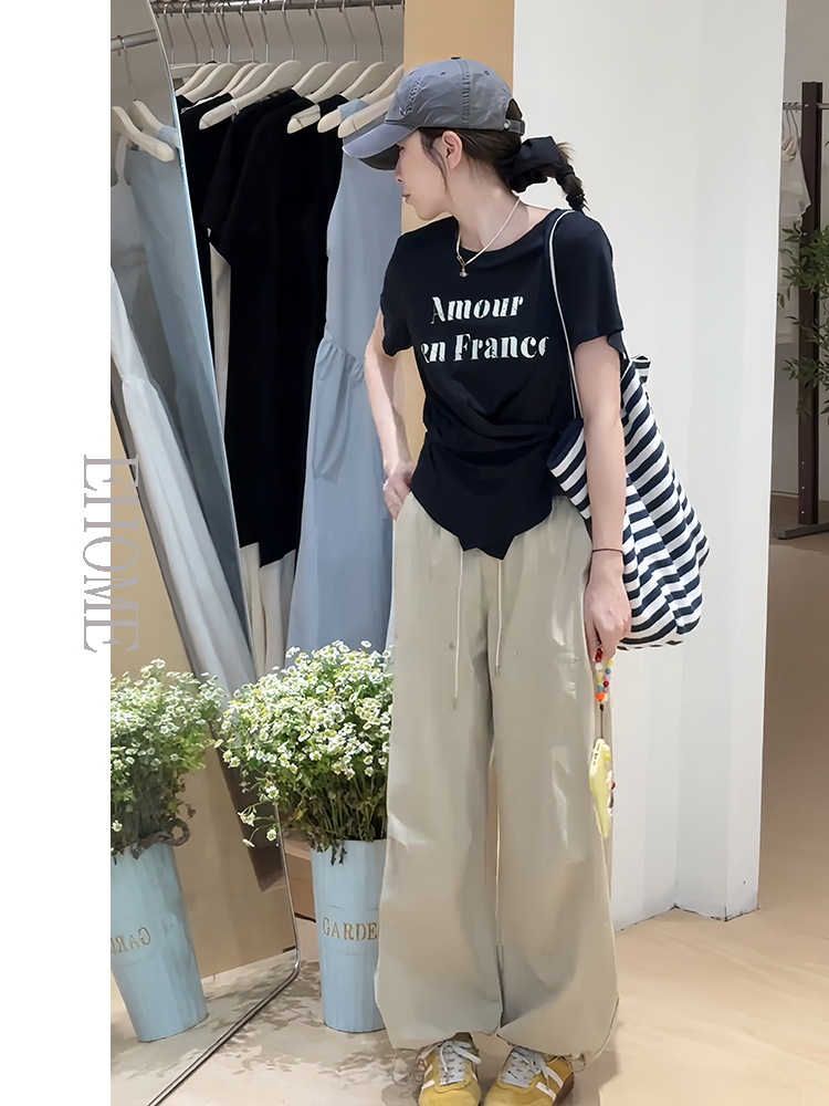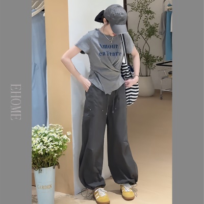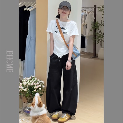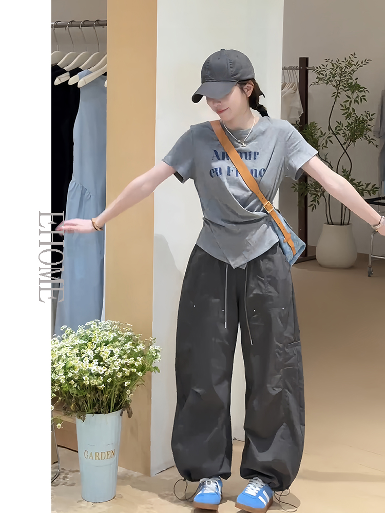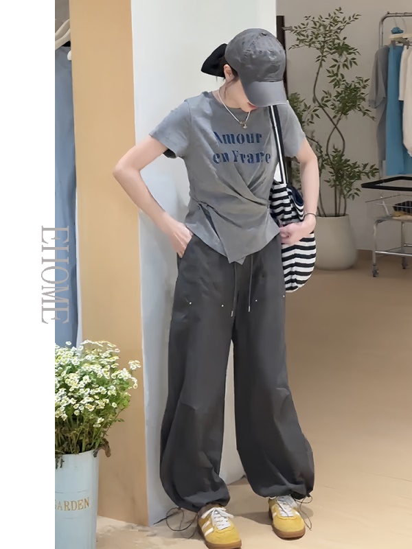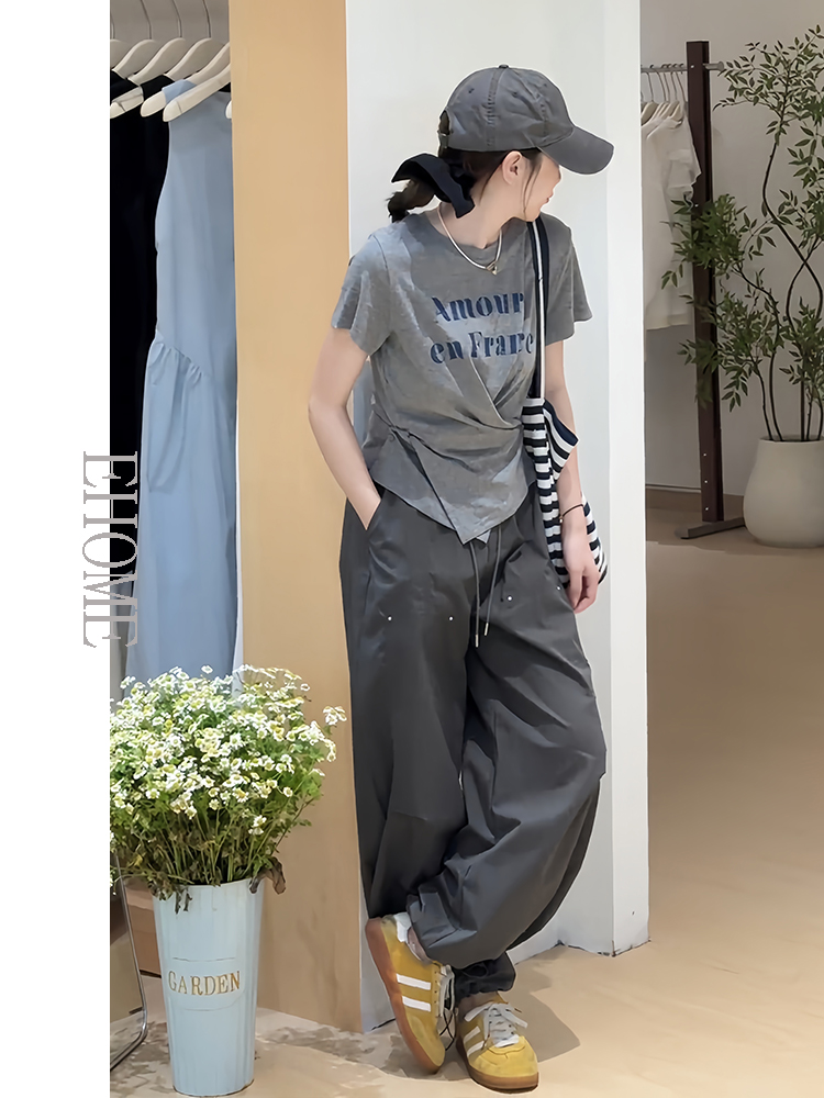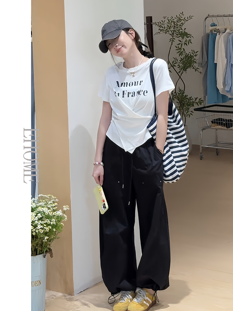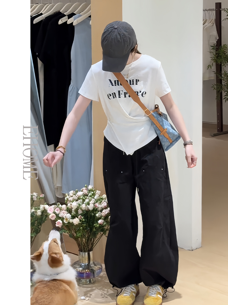 商品名称:夏季减龄一整套穿搭不规则褶皱字母印花短袖T恤束脚休闲工装裤女