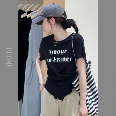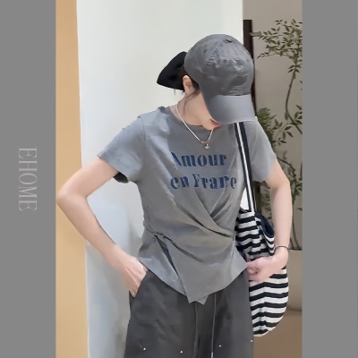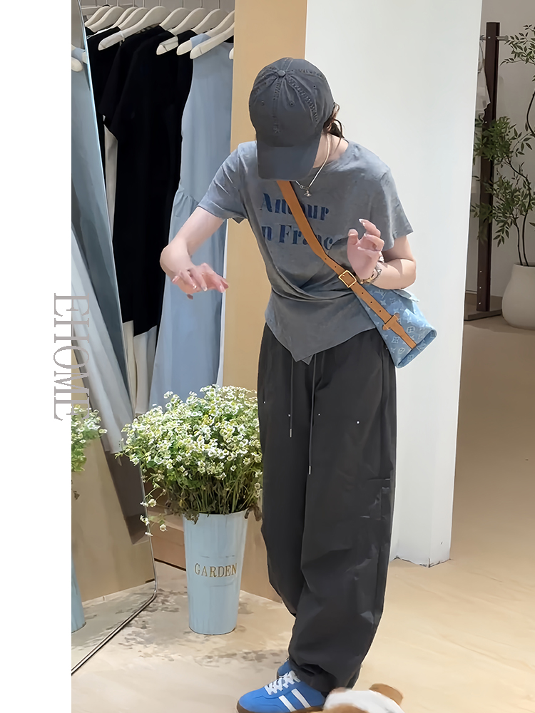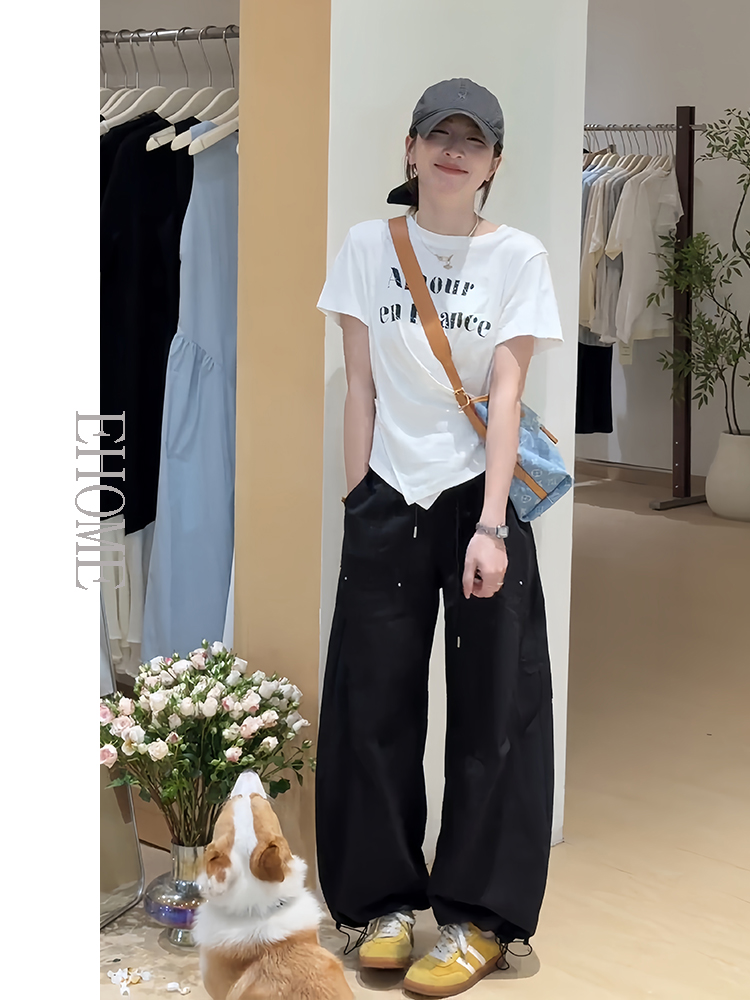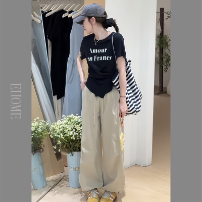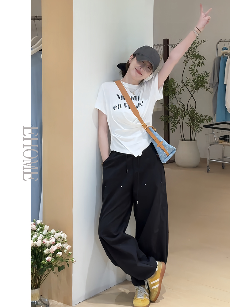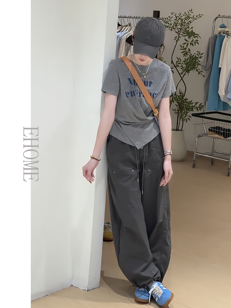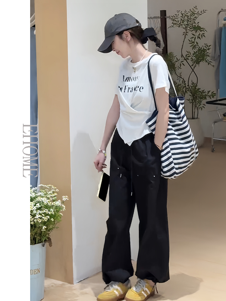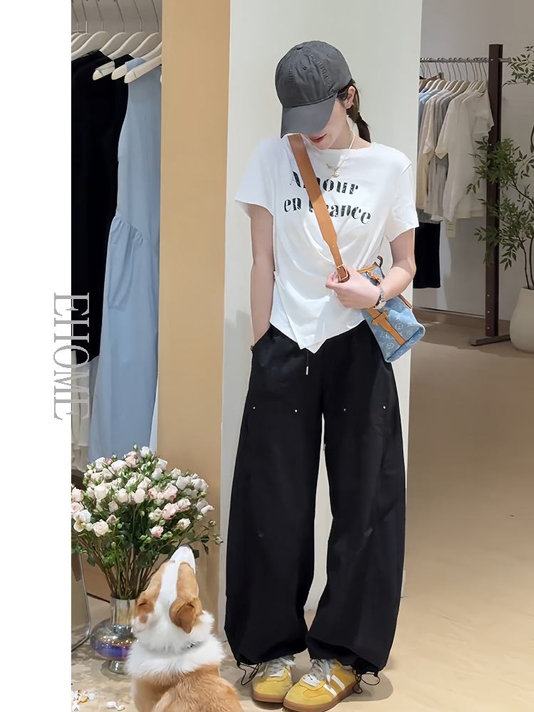商品名称:夏季减龄一整套穿搭不规则褶皱字母印花短袖T恤束脚休闲工装裤女