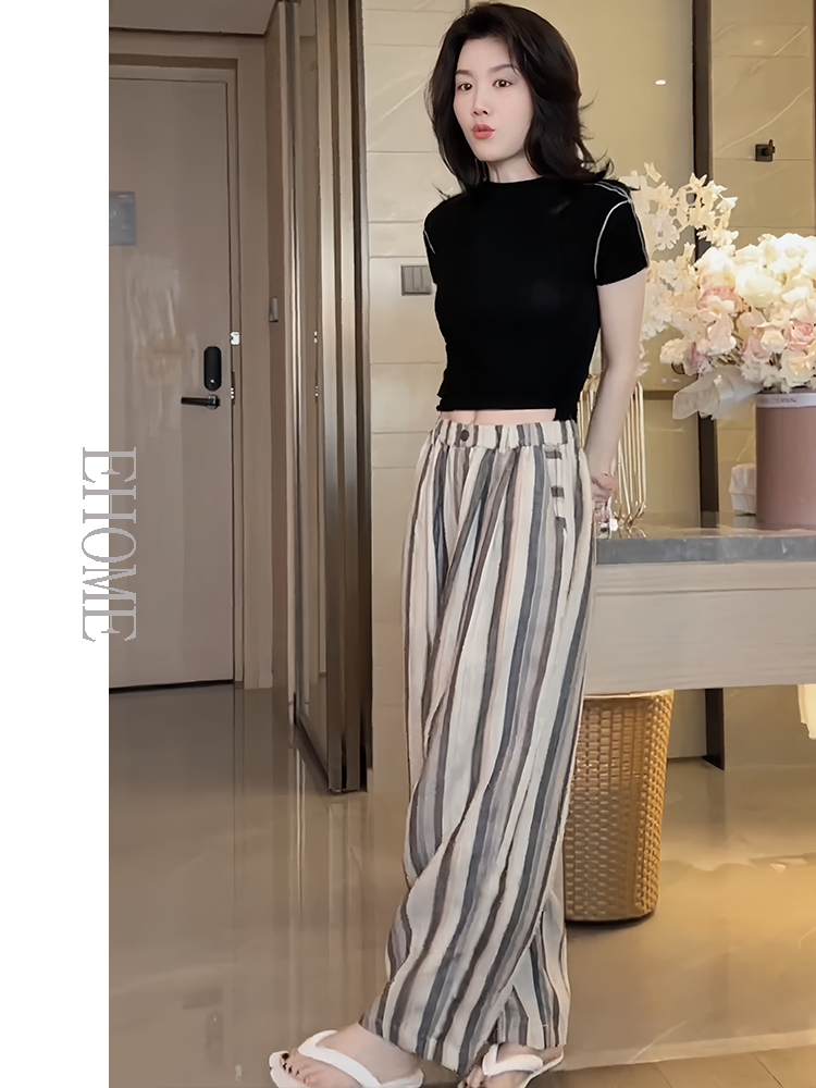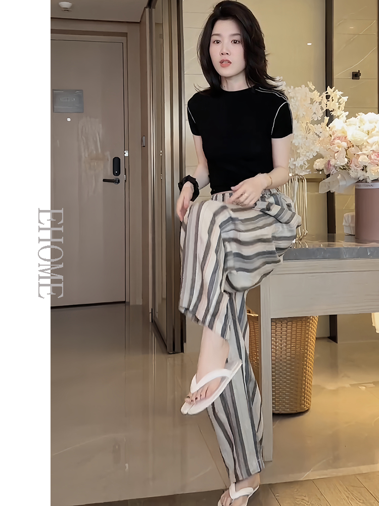 今年流行的夏装圆领波浪边拼接高弹力天丝T恤彩色竖条纹休闲裤女