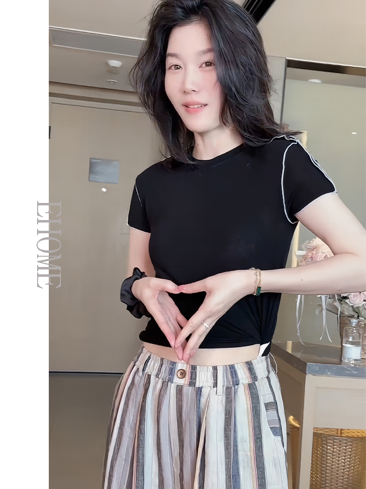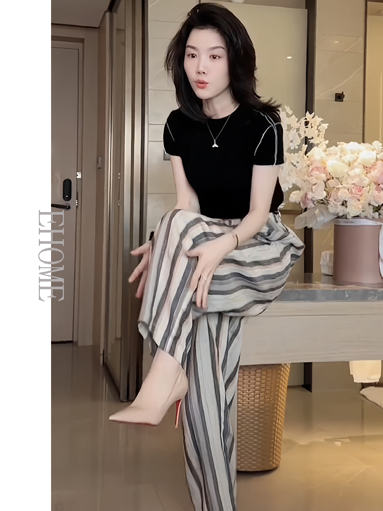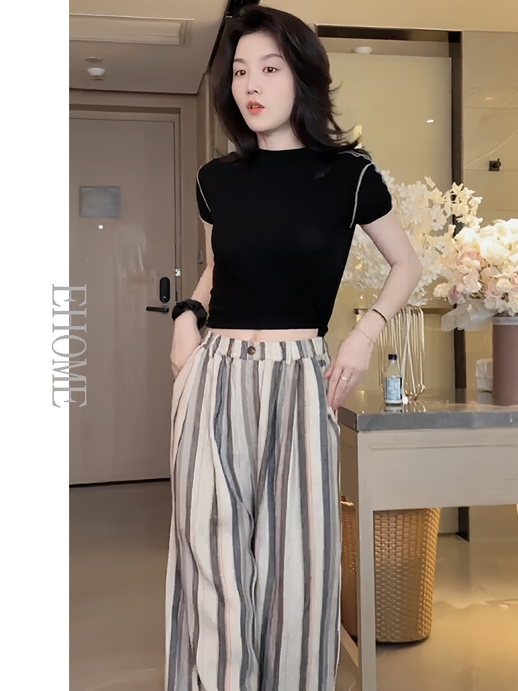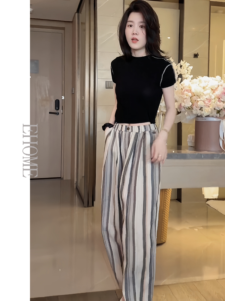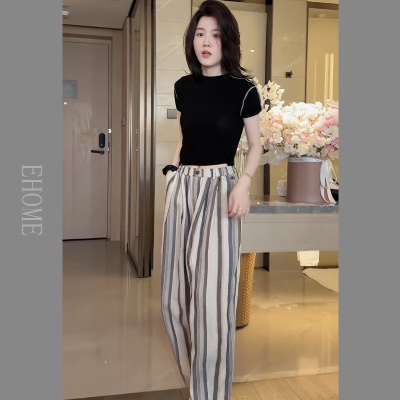 商品名称:今年流行的夏装圆领波浪边拼接高弹力天丝T恤彩色竖条纹休闲裤女