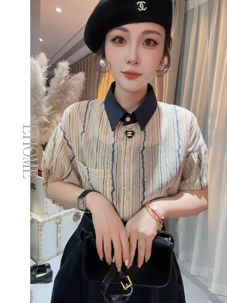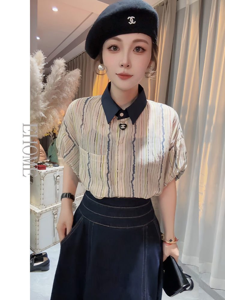 套装女2025新款韩系减龄条纹撞色拼接防晒衫高腰显瘦宽松牛仔短裤