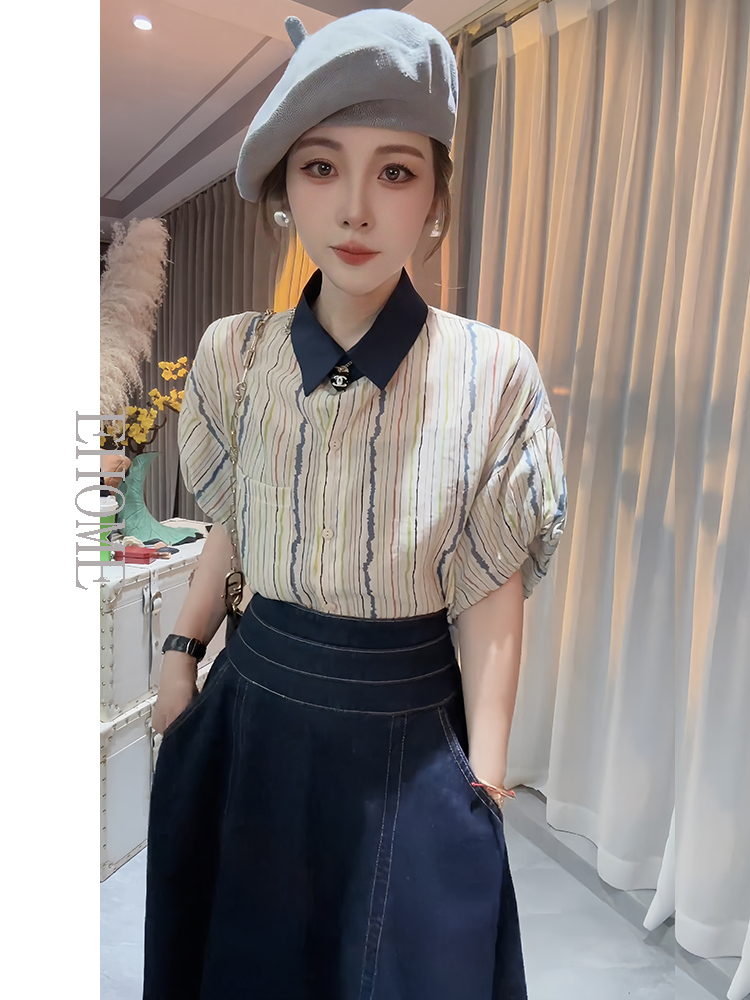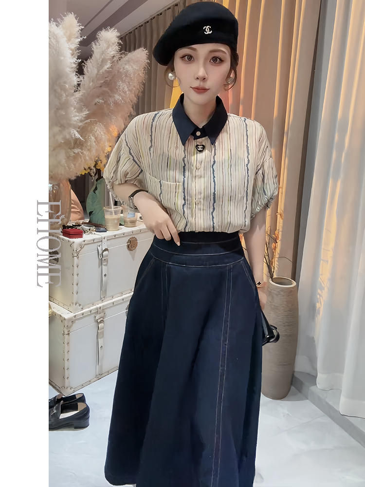 欧货洋气花苞袖竖条纹短袖小衫上衣高腰设计感牛仔半身裙子套装女