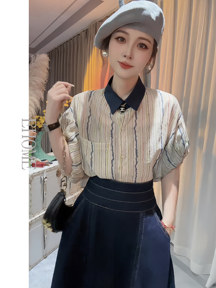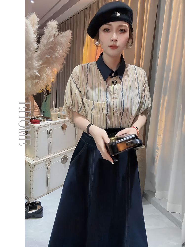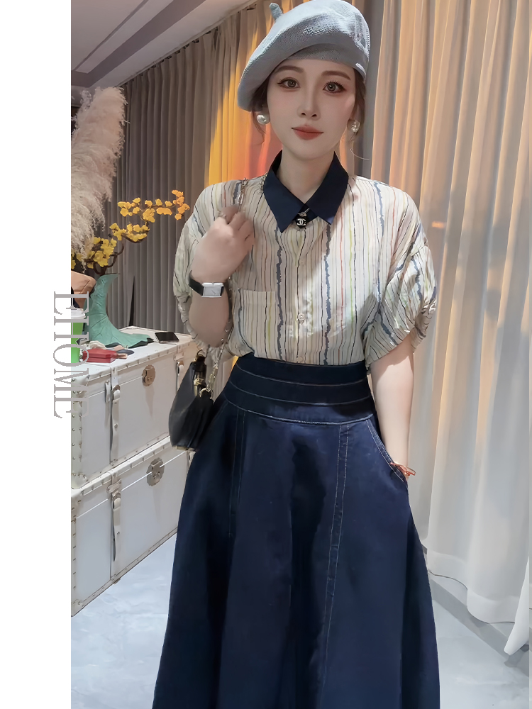 竖条纹衬衫+蓝色牛仔半身裙