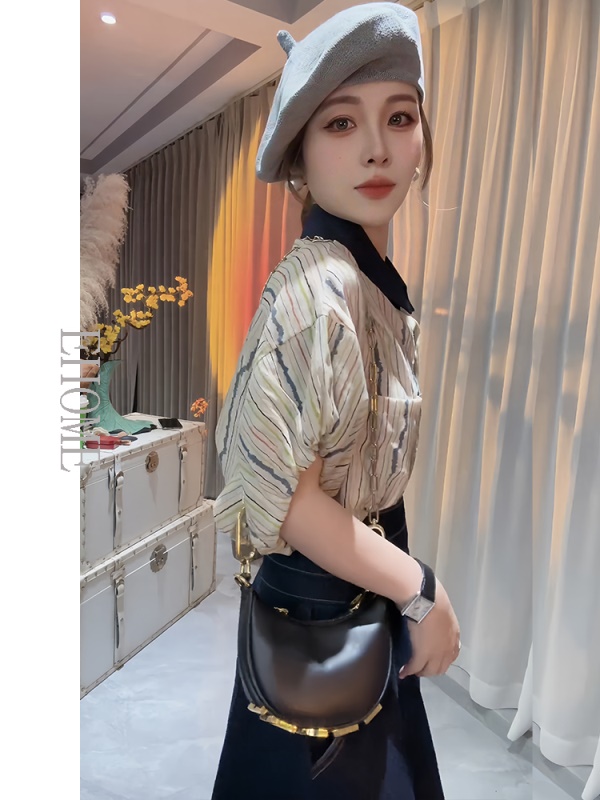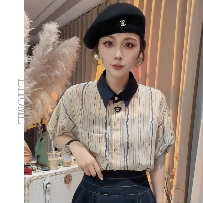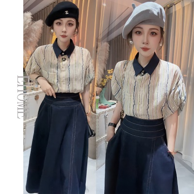商品名称:欧货洋气花苞袖竖条纹短袖小衫上衣高腰设计感牛仔半身裙子套装女
