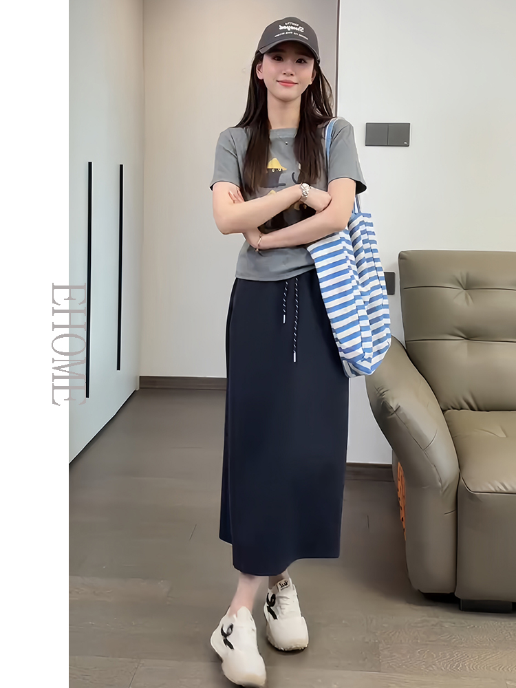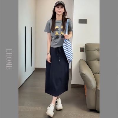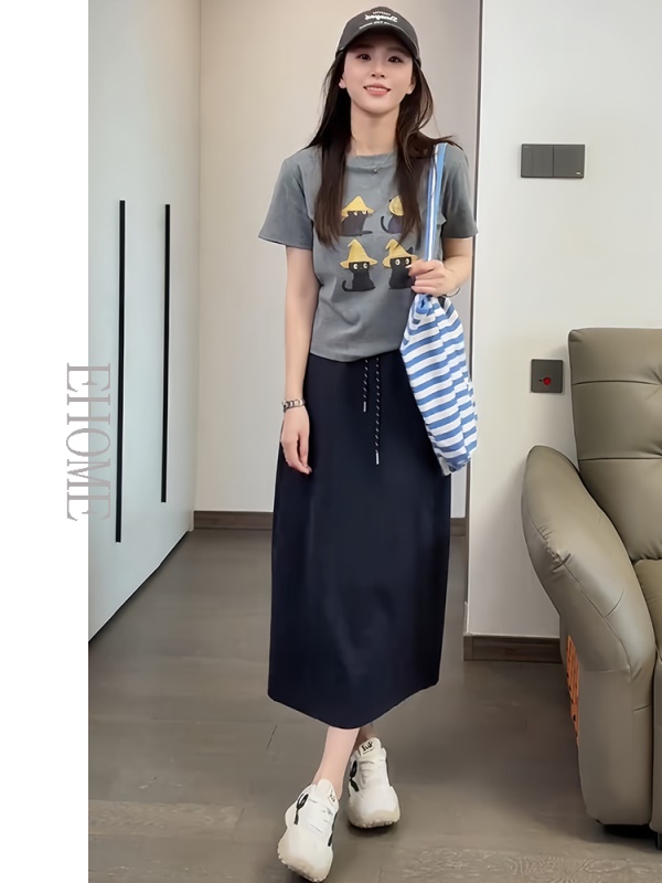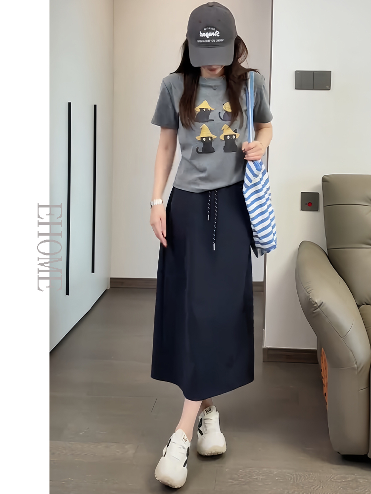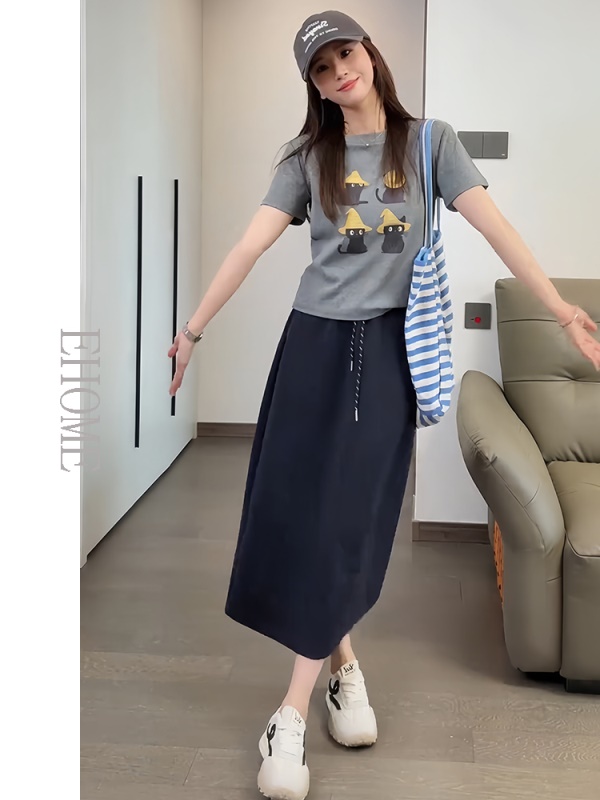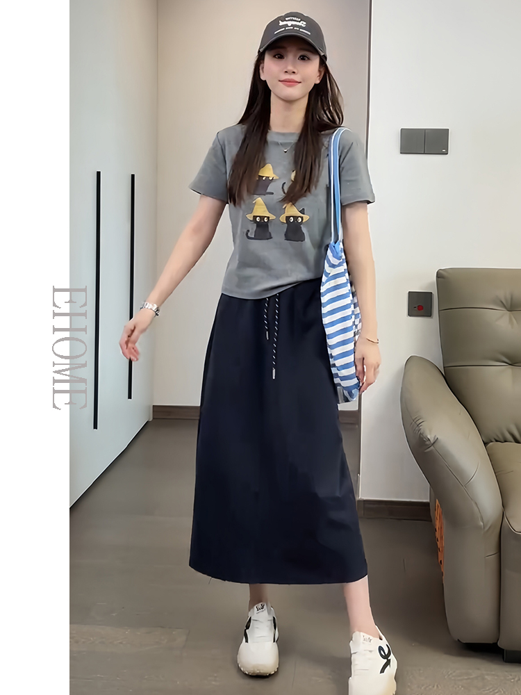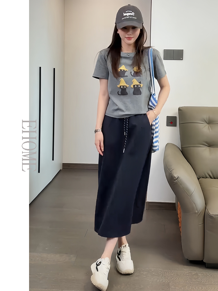 商品名称:2025超火夏装一整套卡通小猫圆领短袖T恤百搭气质抽绳半身裙套装