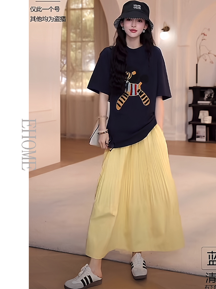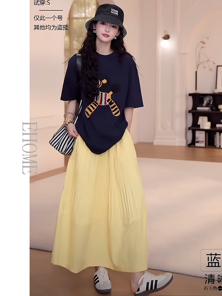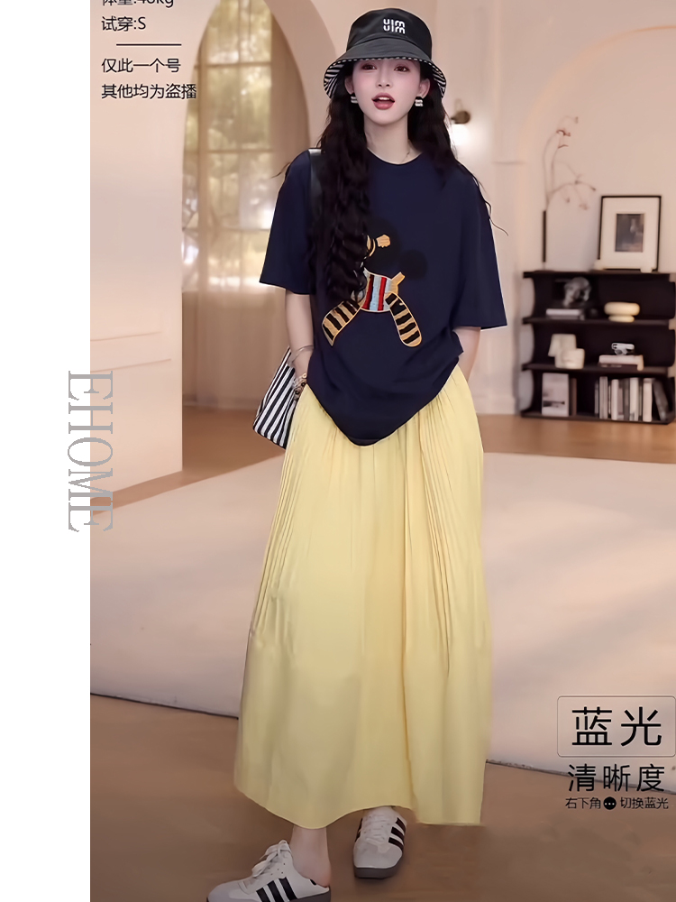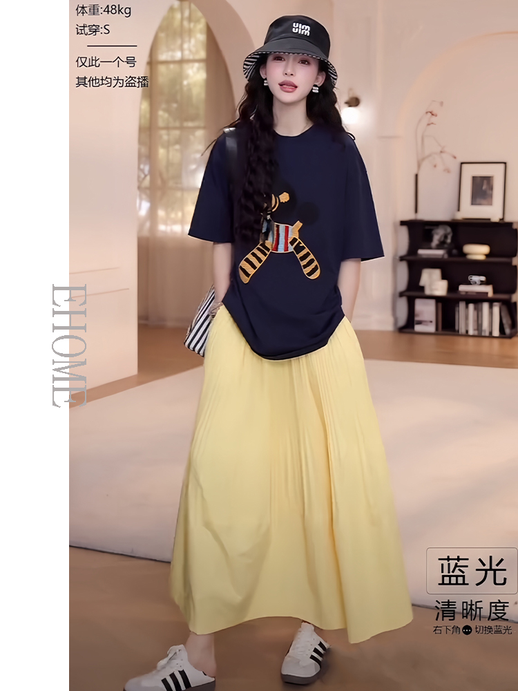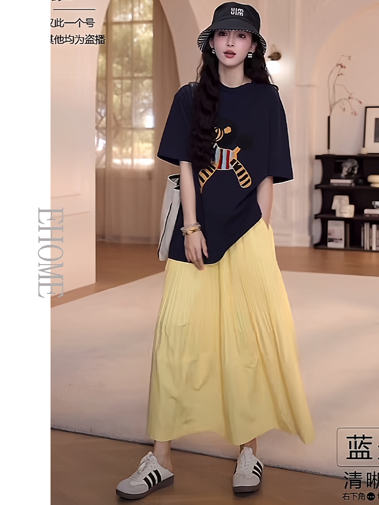 藏蓝色短袖T恤+黄色半身裙