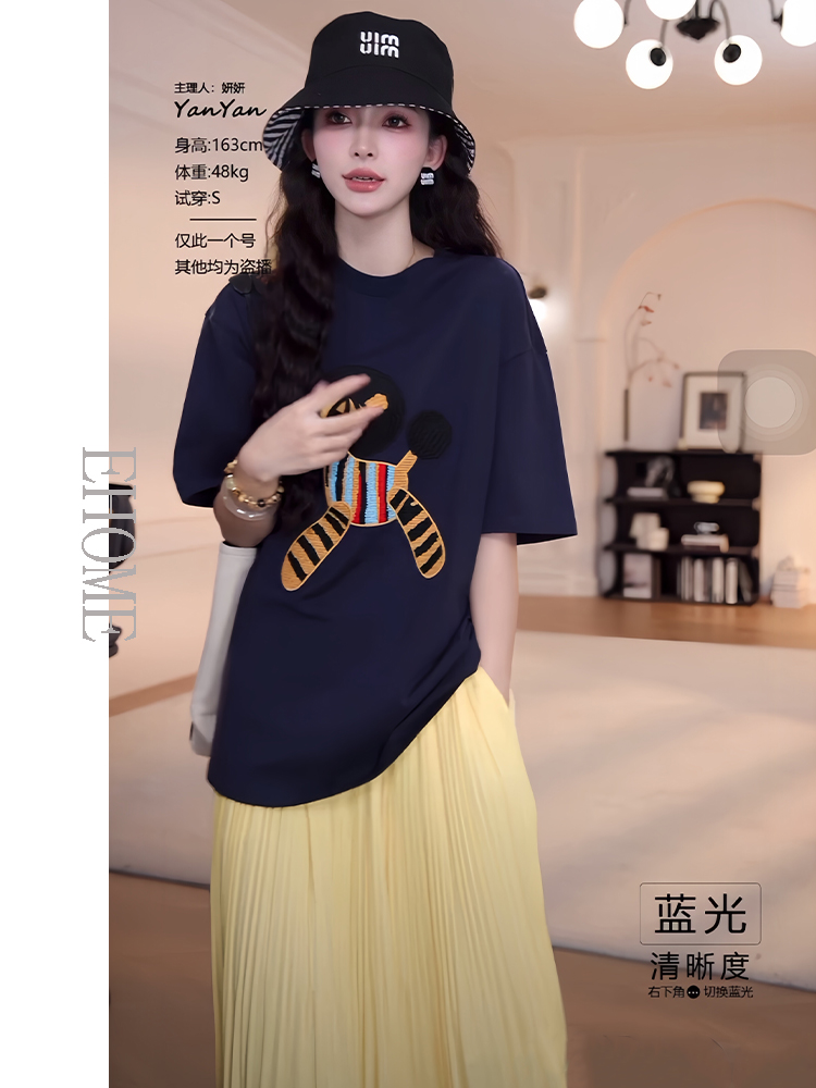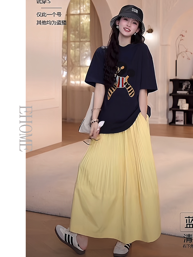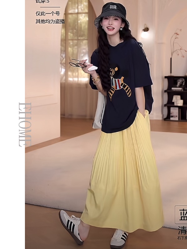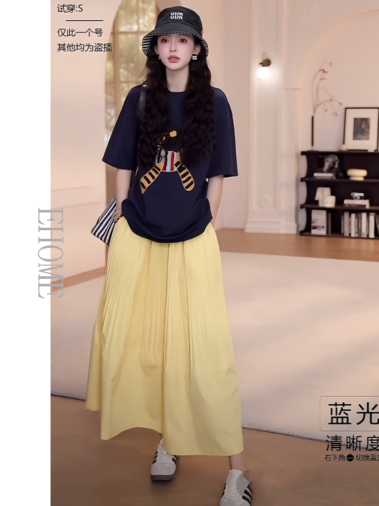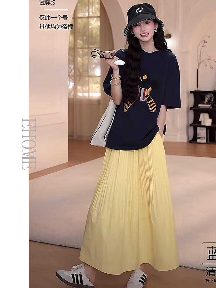 藏蓝色短袖T恤+黄色半身裙