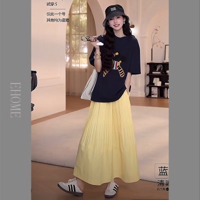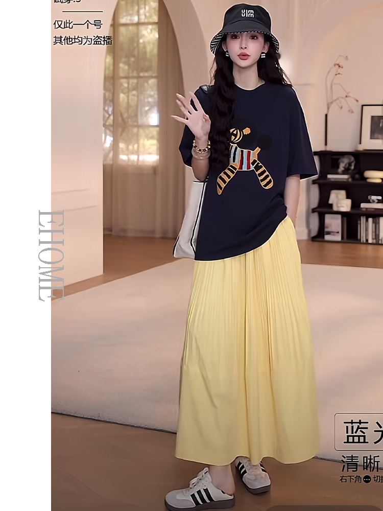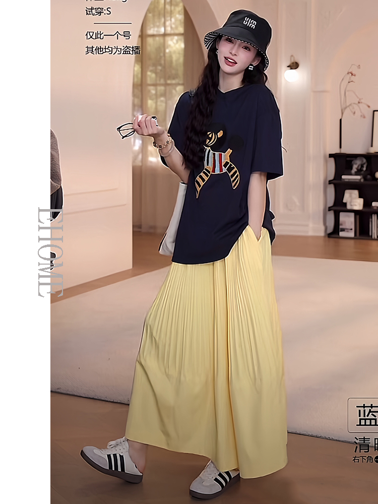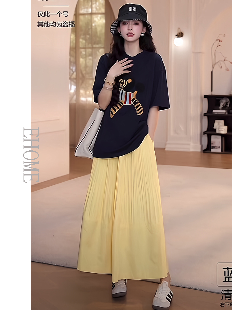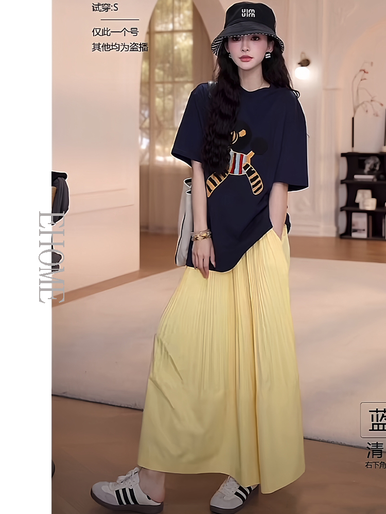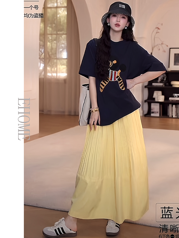 夏日多巴胺穿搭套装慵懒风减龄宽松小马短袖T恤松紧腰压褶半身裙