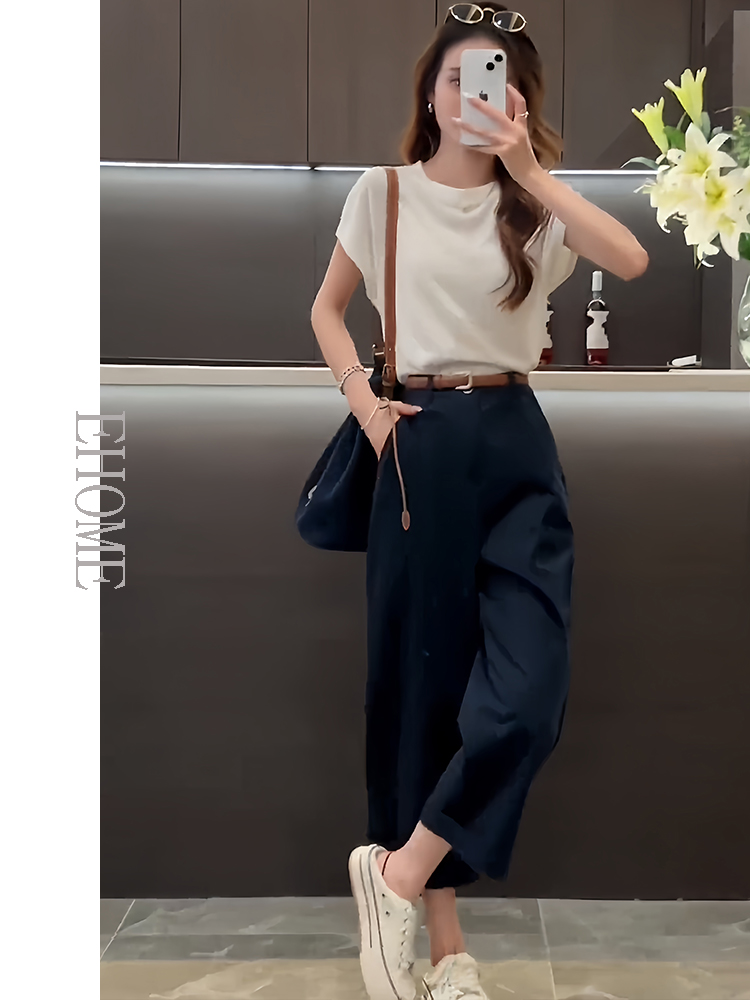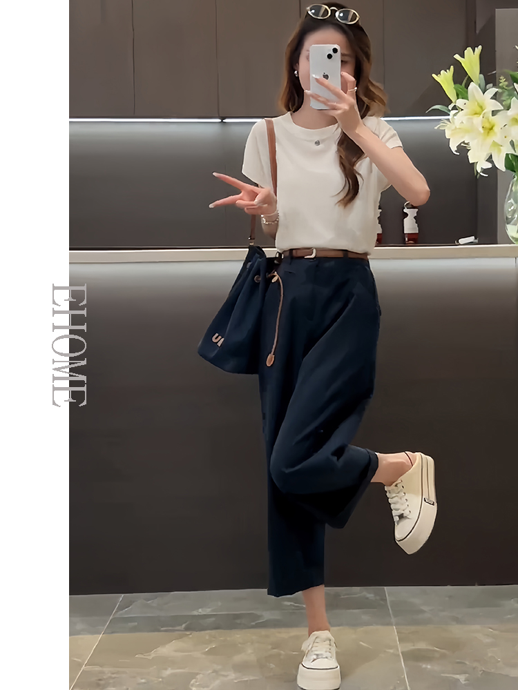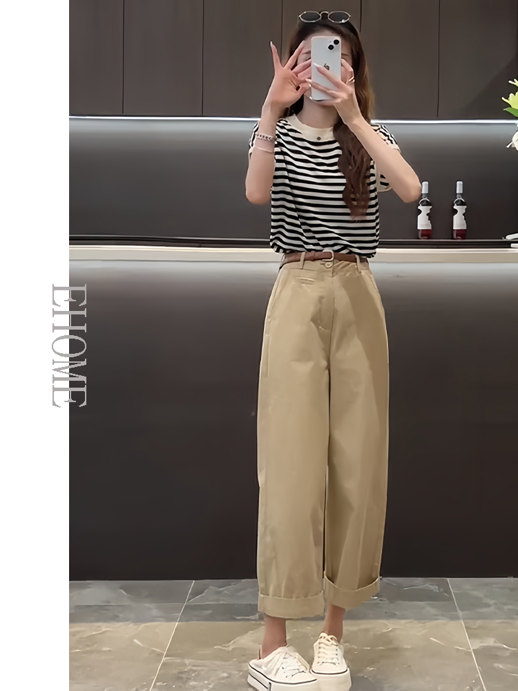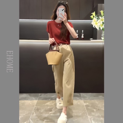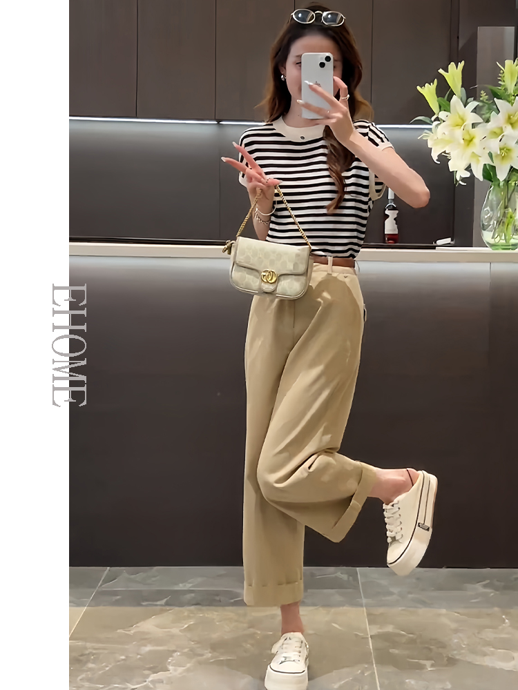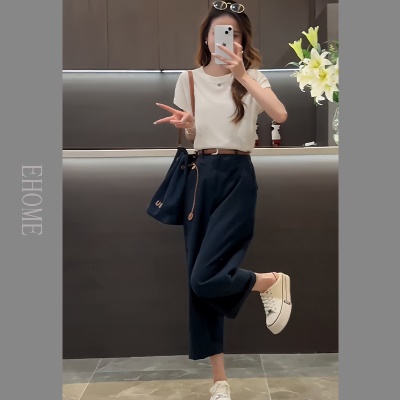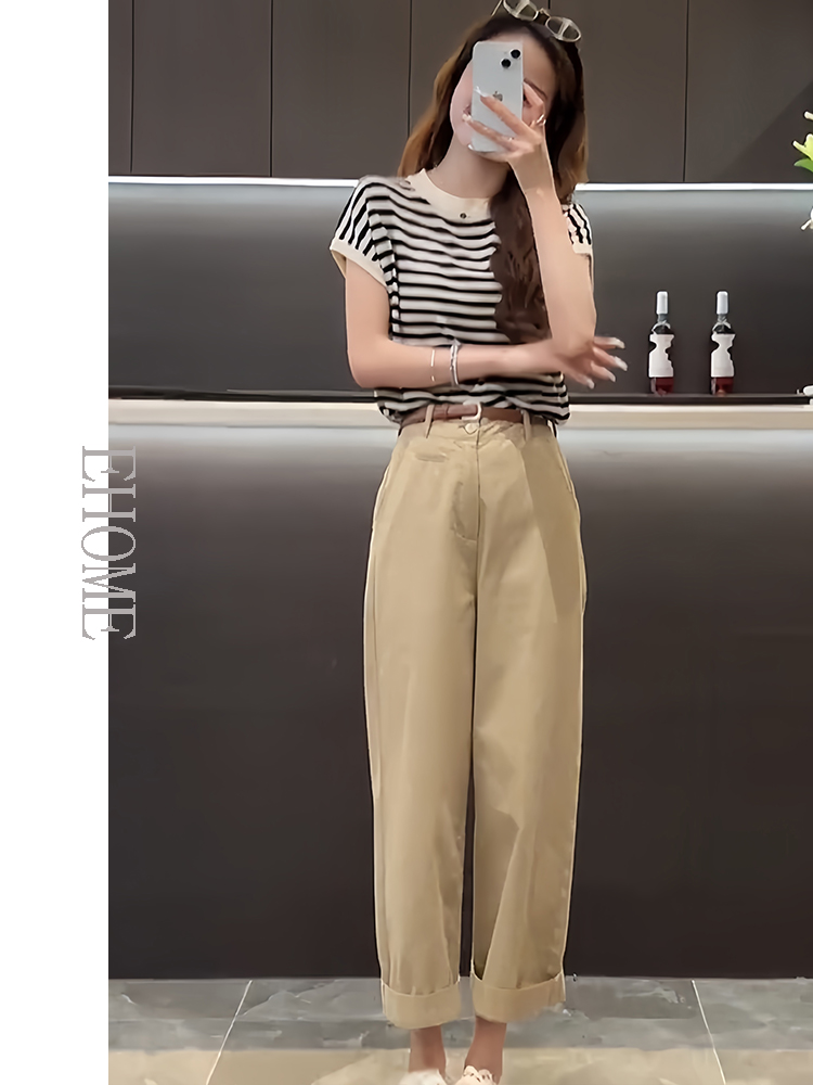 可盐可甜套装夏季新款针织条纹百搭显瘦上衣九分休闲直筒裤两件套