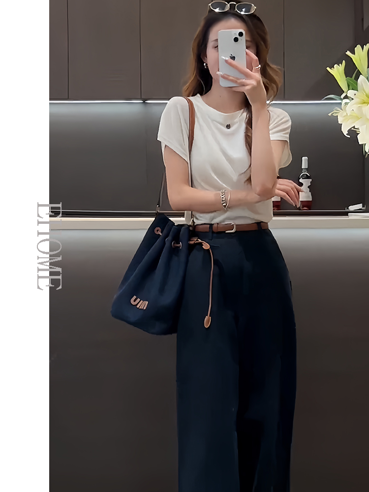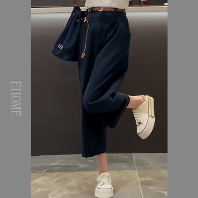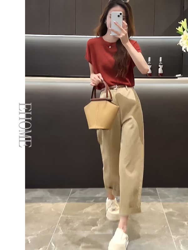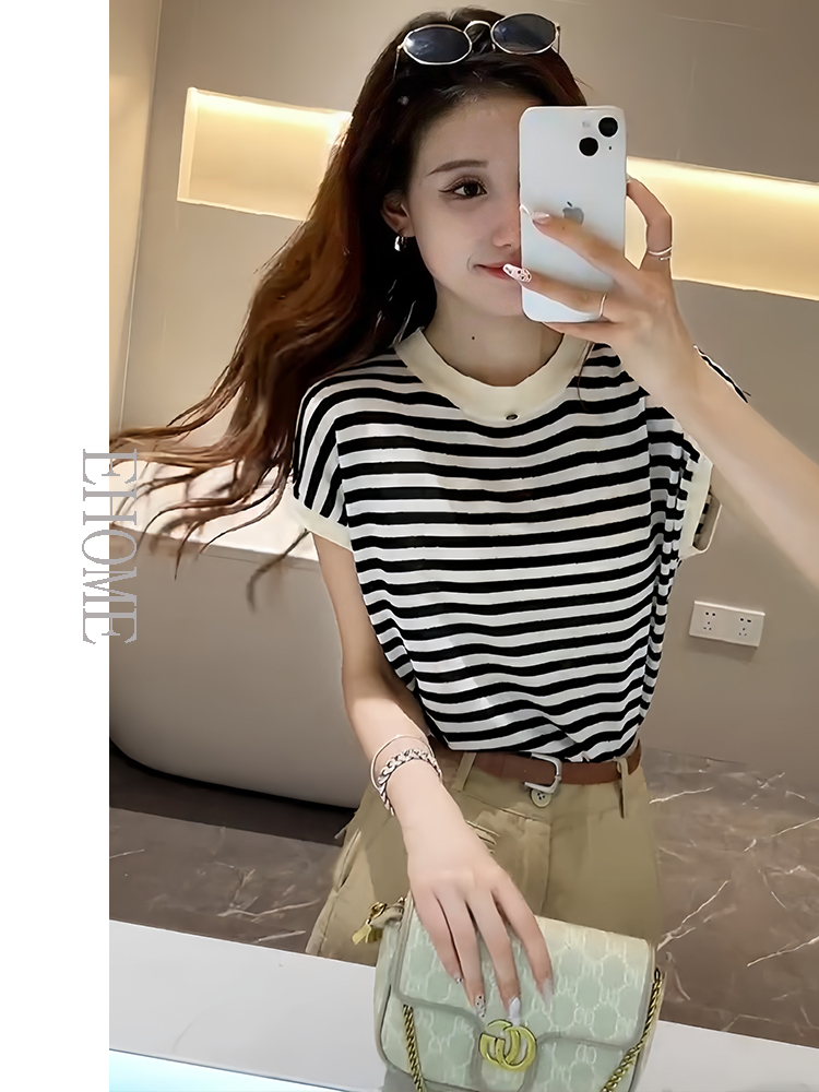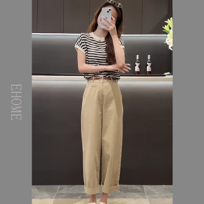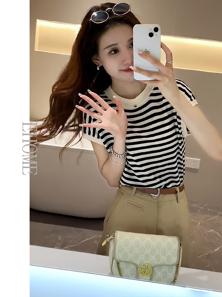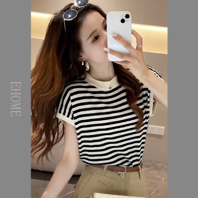 商品名称:可盐可甜套装夏季新款针织条纹百搭显瘦上衣九分休闲直筒裤两件套