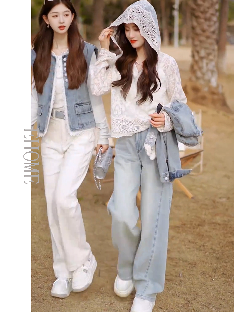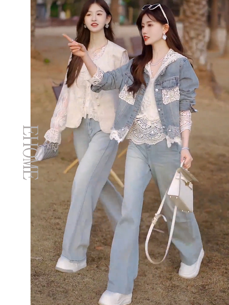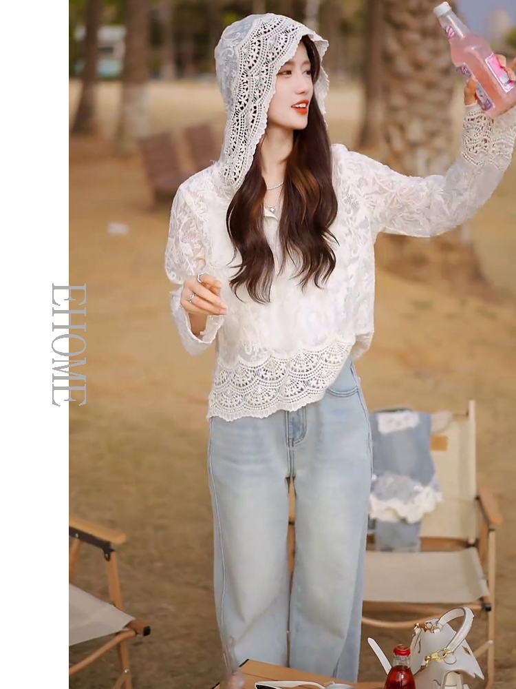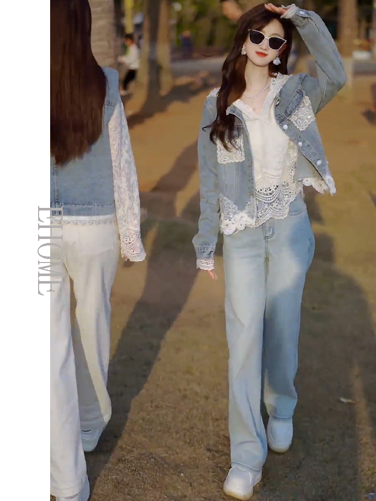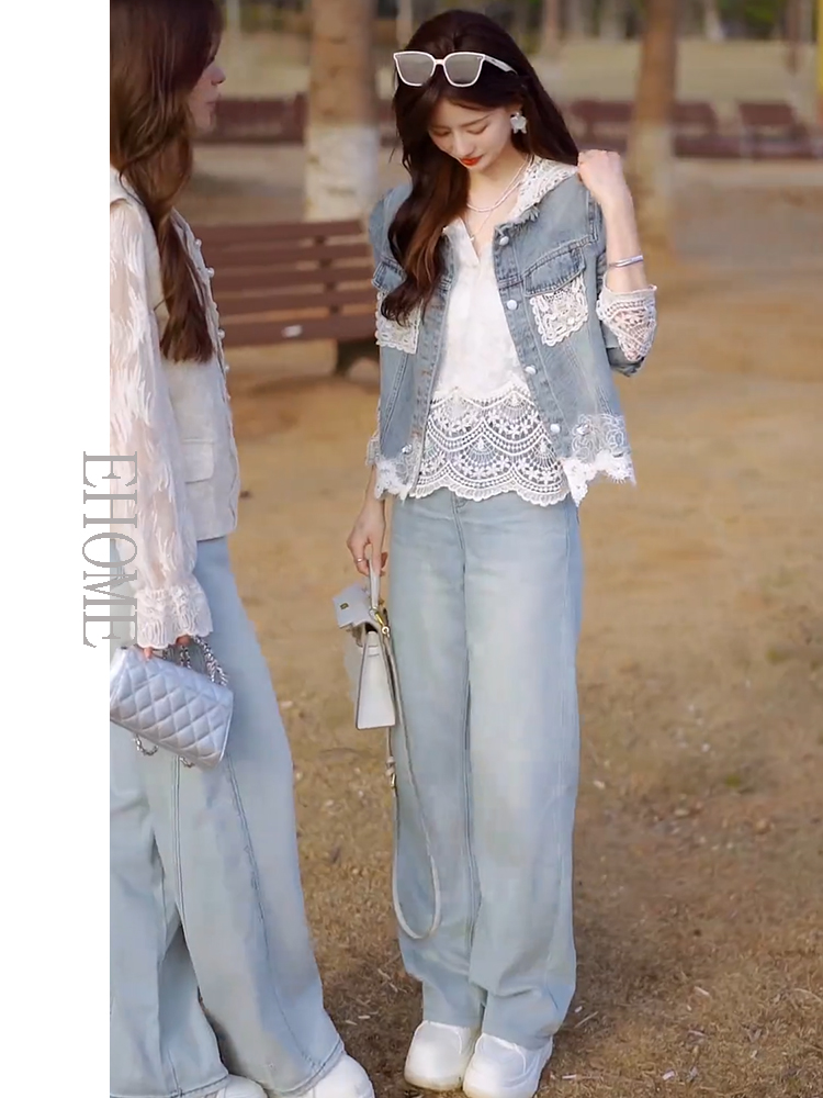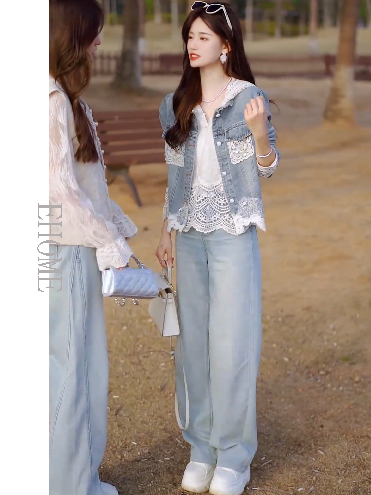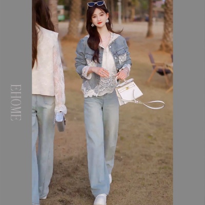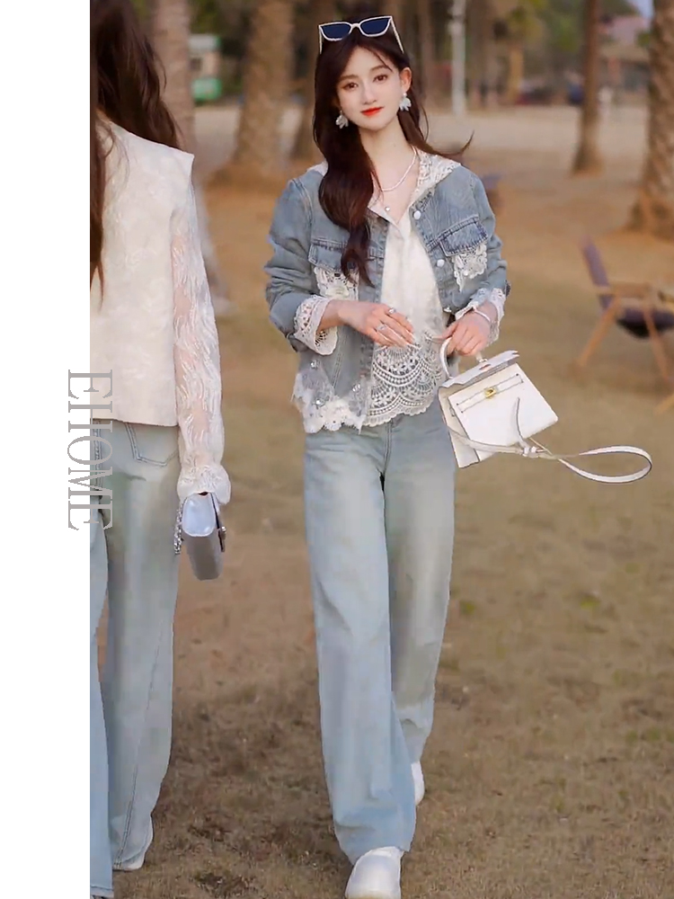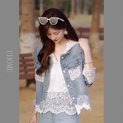独特绝美初春小套装气质减龄百搭蕾丝连帽长袖小衫拼接牛仔短外套