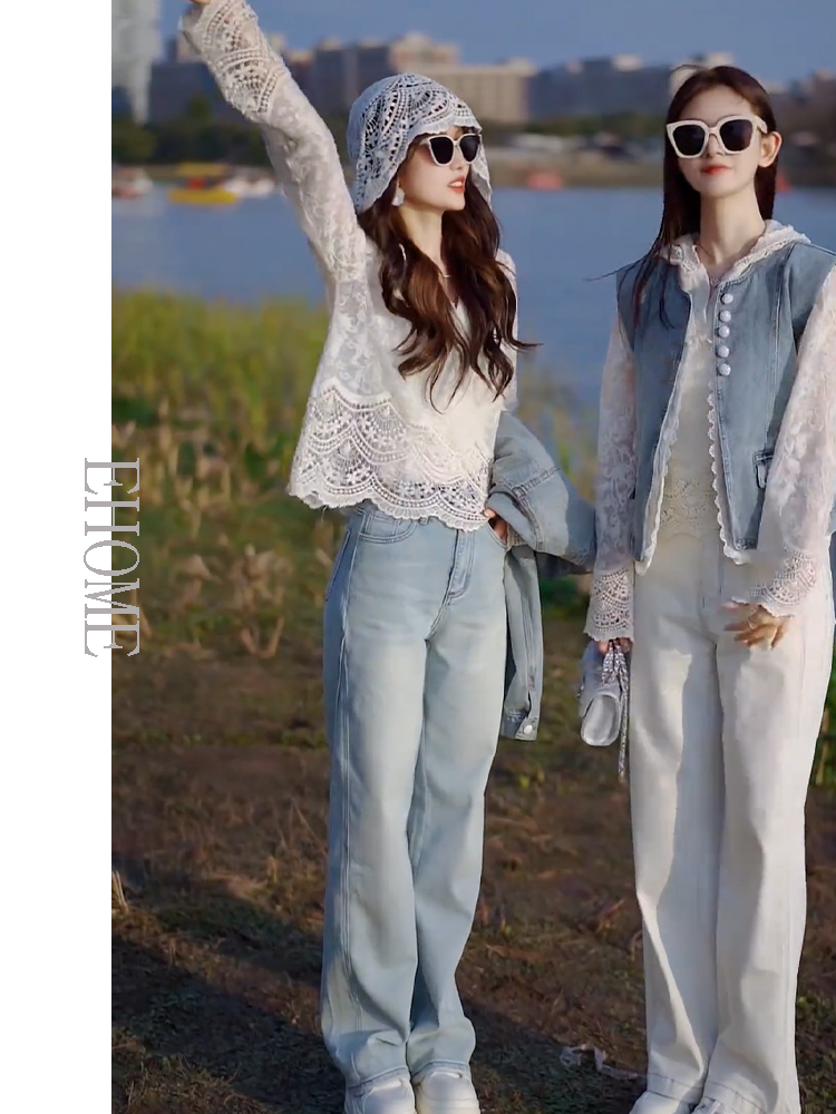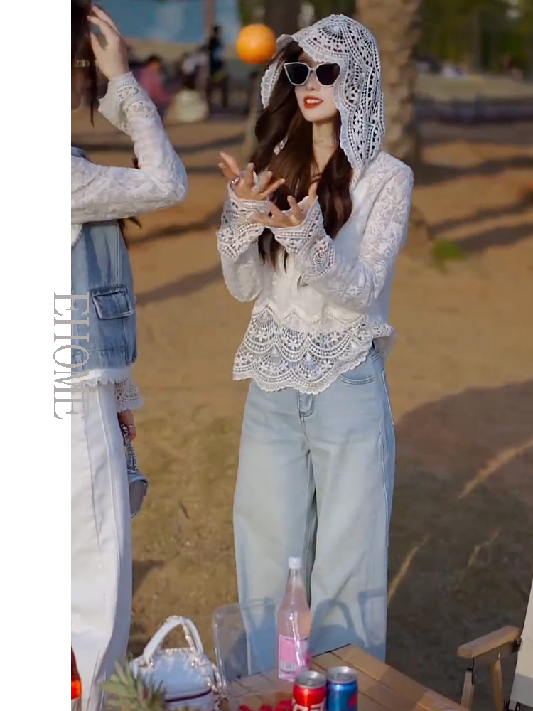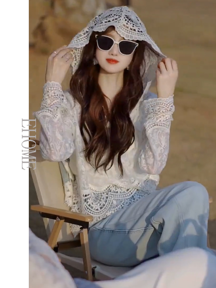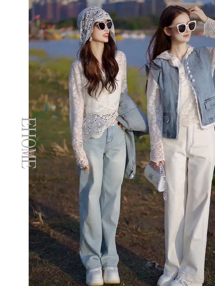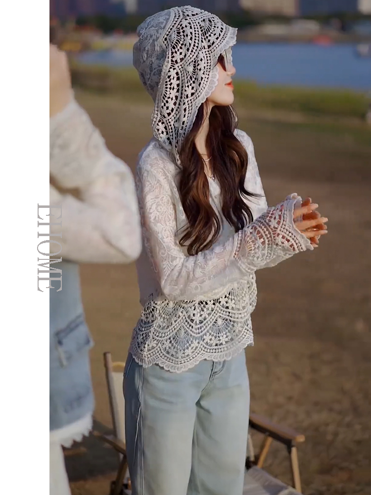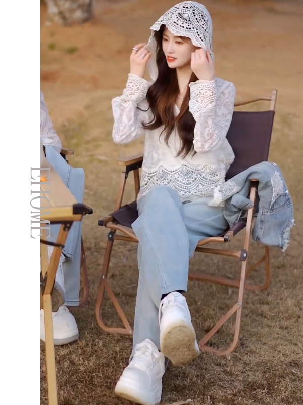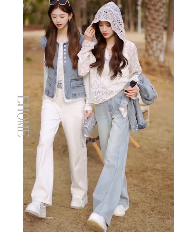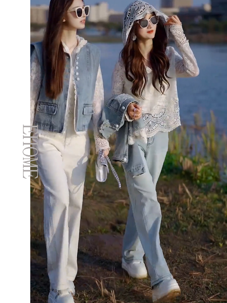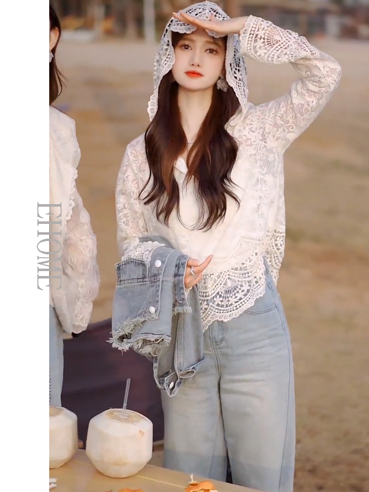 独特绝美初春小套装气质减龄百搭蕾丝连帽长袖小衫拼接牛仔短外套