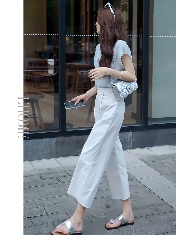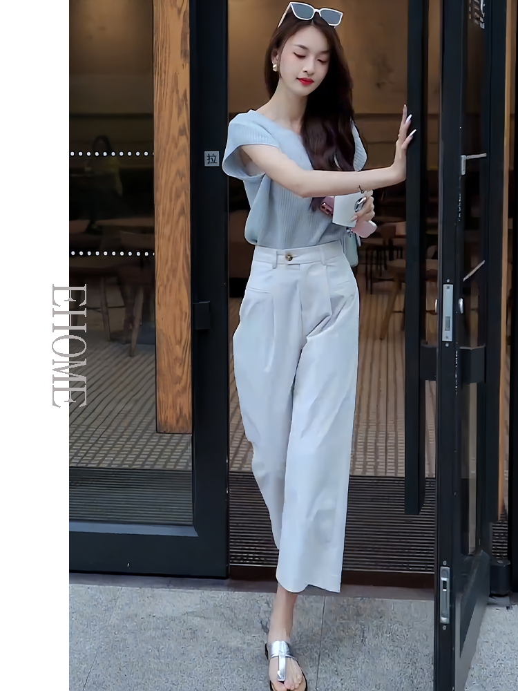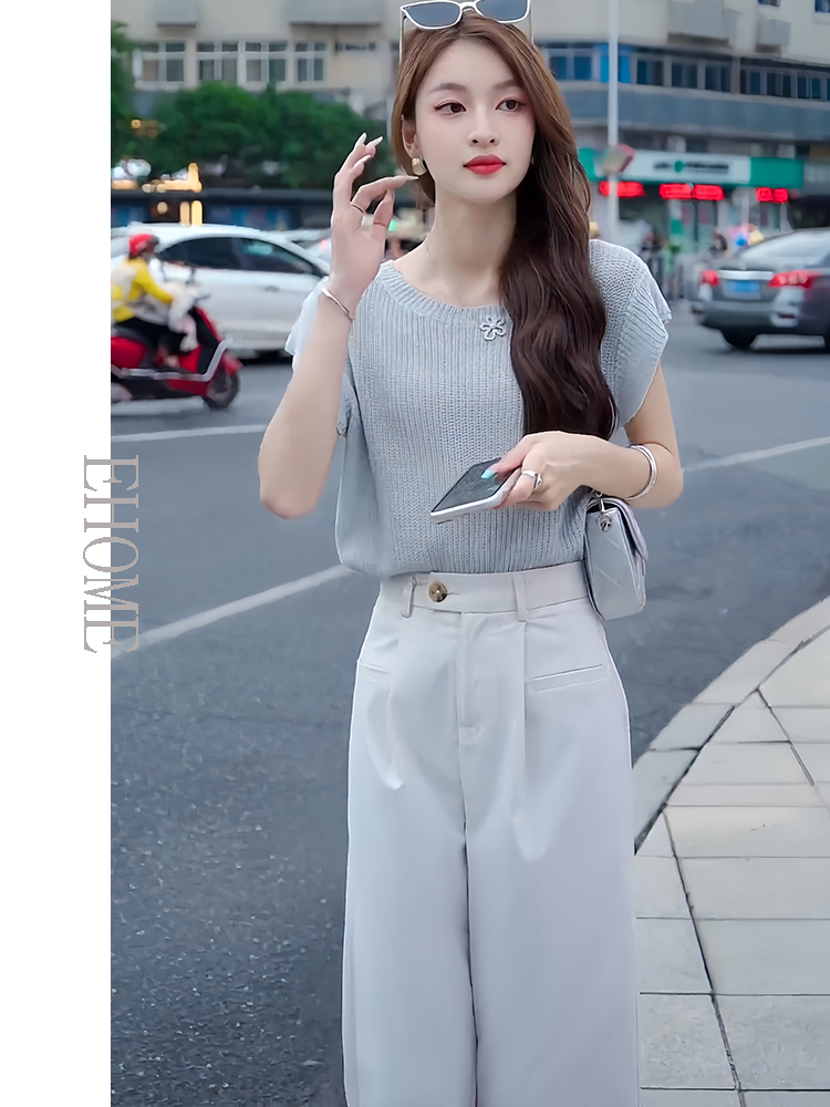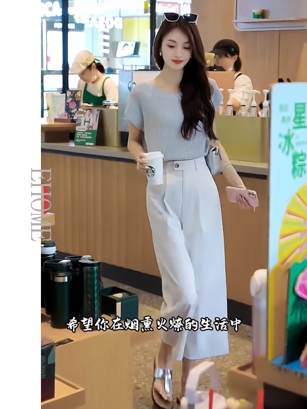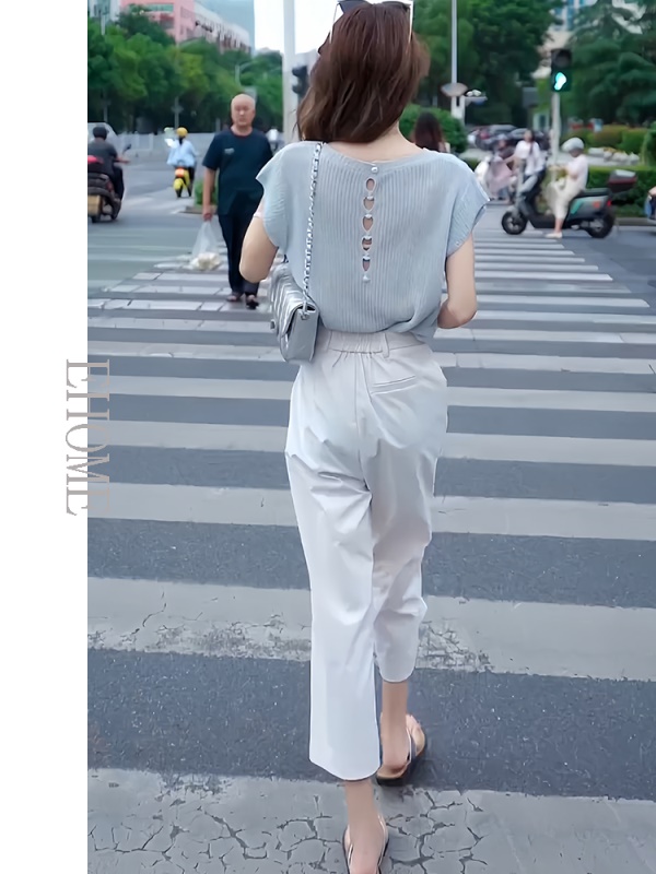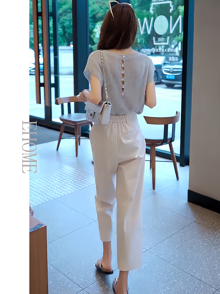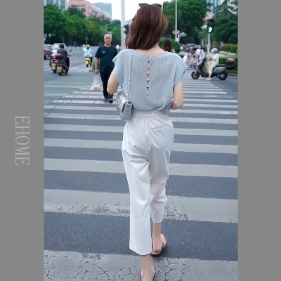 商品名称:欧货时尚套装夏季新款后背镂空短袖针织T恤高腰薄款松紧腰九分裤