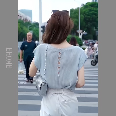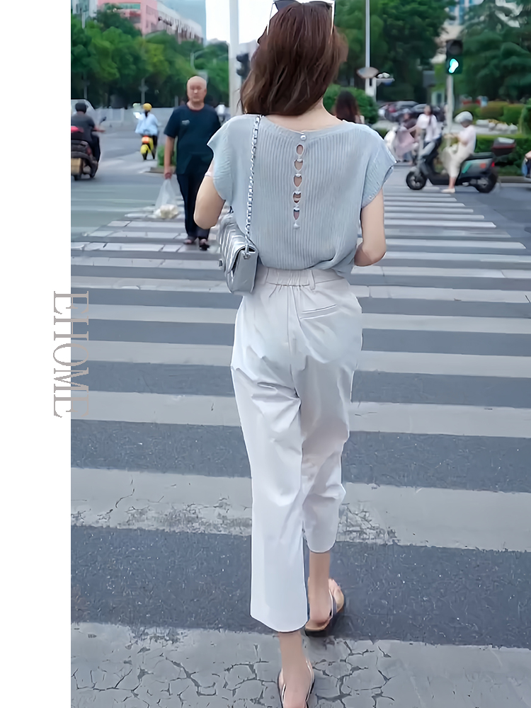 欧货时尚套装夏季新款后背镂空短袖针织T恤高腰薄款松紧腰九分裤