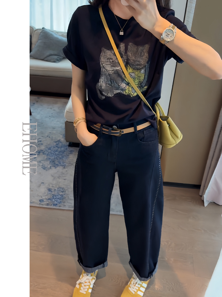 2025超火夏装一整套韩系小猫印花短袖T恤百搭显瘦哈伦牛仔裤套装