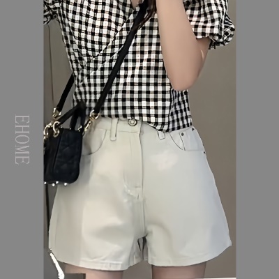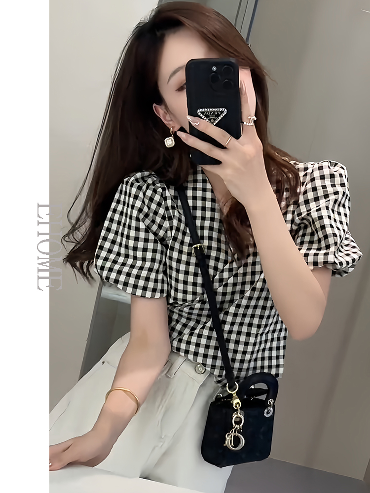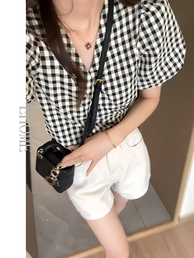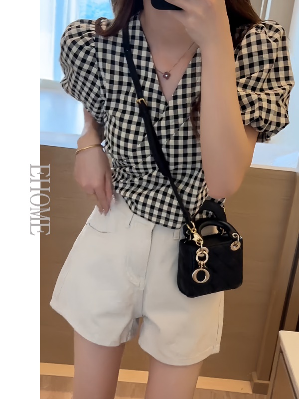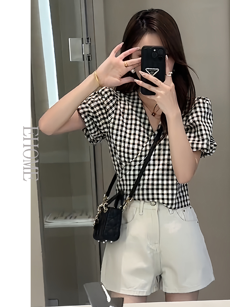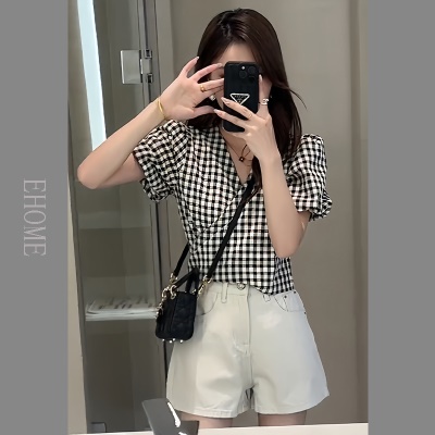 夏装搭配一整套轻熟时尚后背绑带收腰格子泡泡短袖衬衫短裤套装女