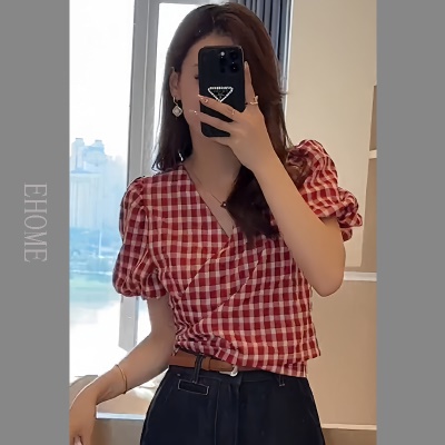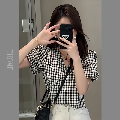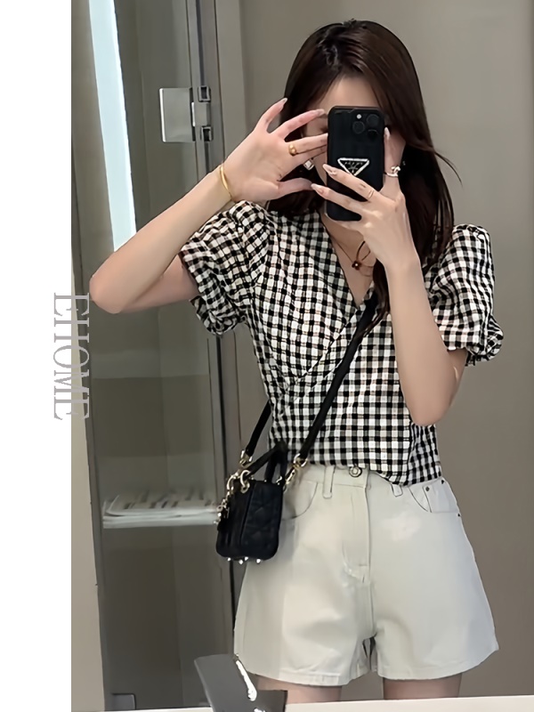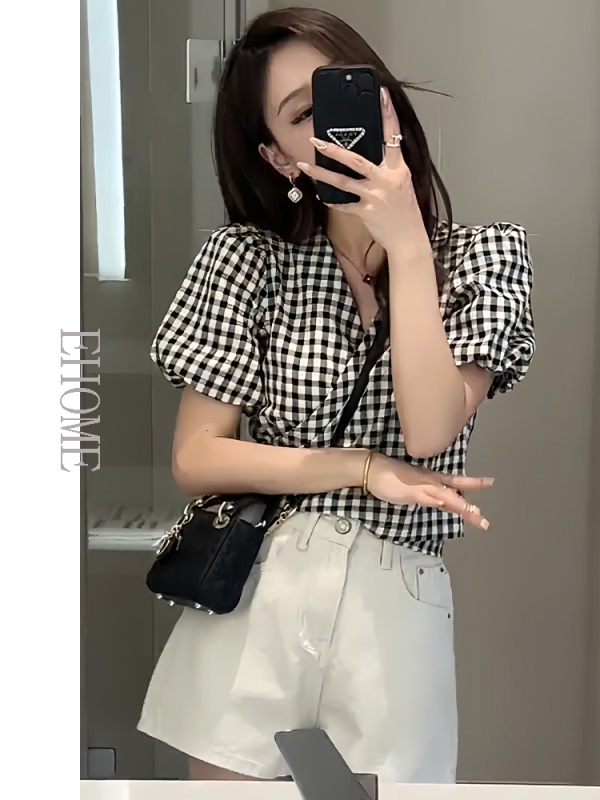 商品名称:夏装搭配一整套轻熟时尚后背绑带收腰格子泡泡短袖衬衫短裤套装女
