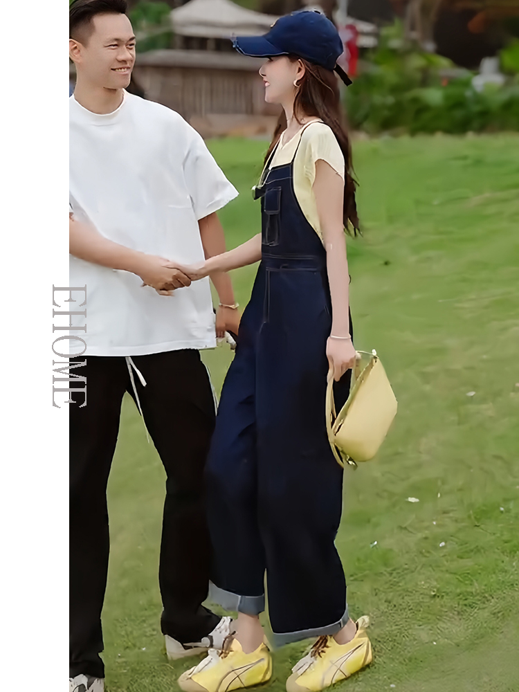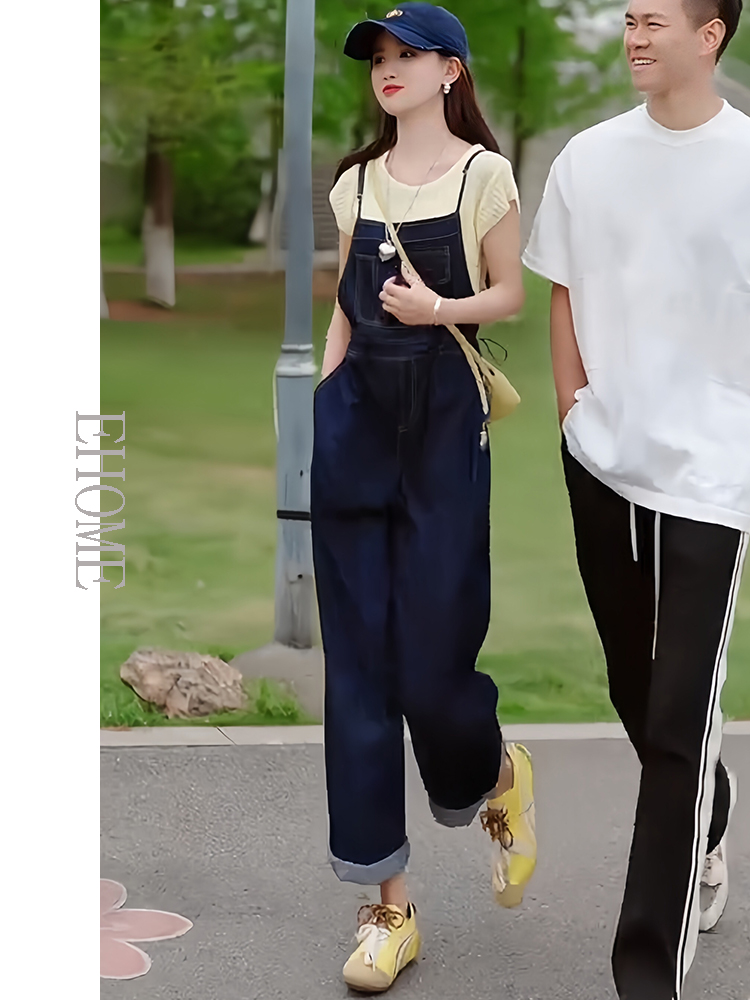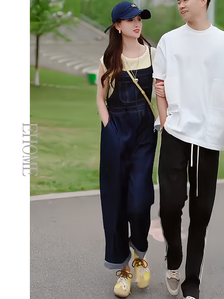 夏日绝美套装穿搭简约抽绳无袖上衣宽松百搭口袋阔腿牛仔背带裤女