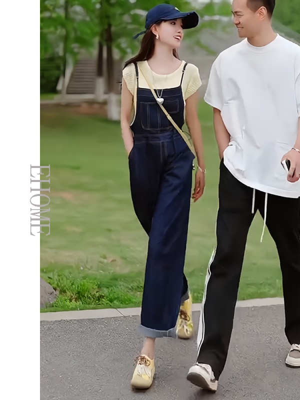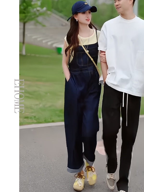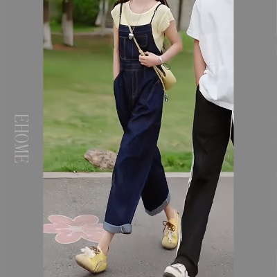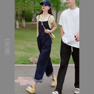 商品名称:夏日绝美套装穿搭简约抽绳无袖上衣宽松百搭口袋阔腿牛仔背带裤女