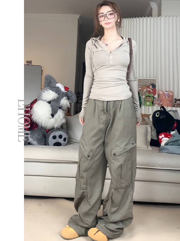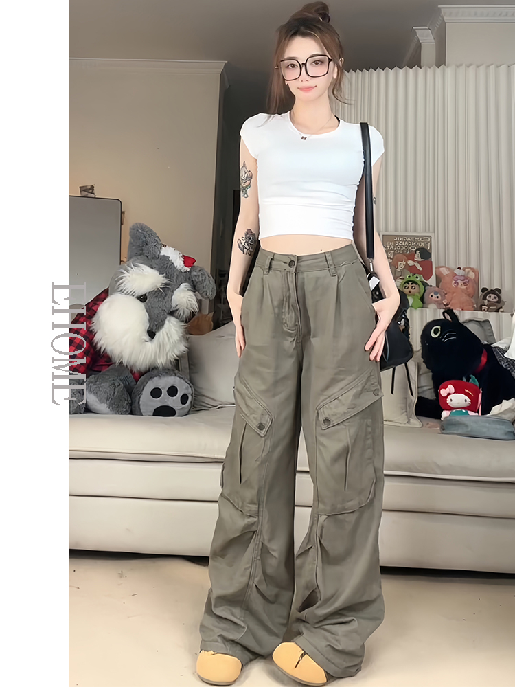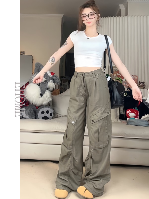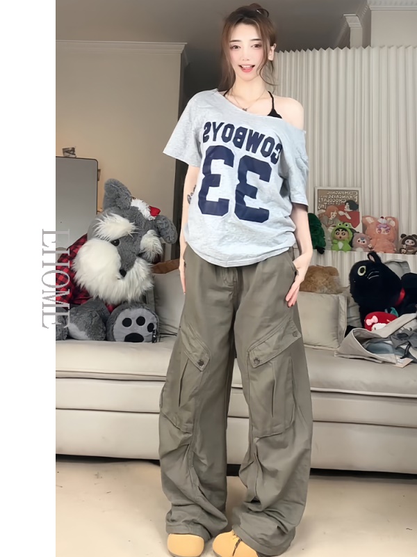 商品名称:美式辣妹斜肩短袖t恤设计感一字露肩上衣复古宽松百搭拖地工装裤