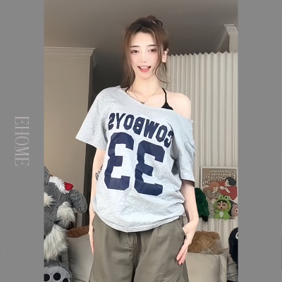 美式辣妹斜肩短袖t恤设计感一字露肩上衣复古宽松百搭拖地工装裤