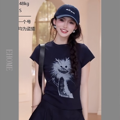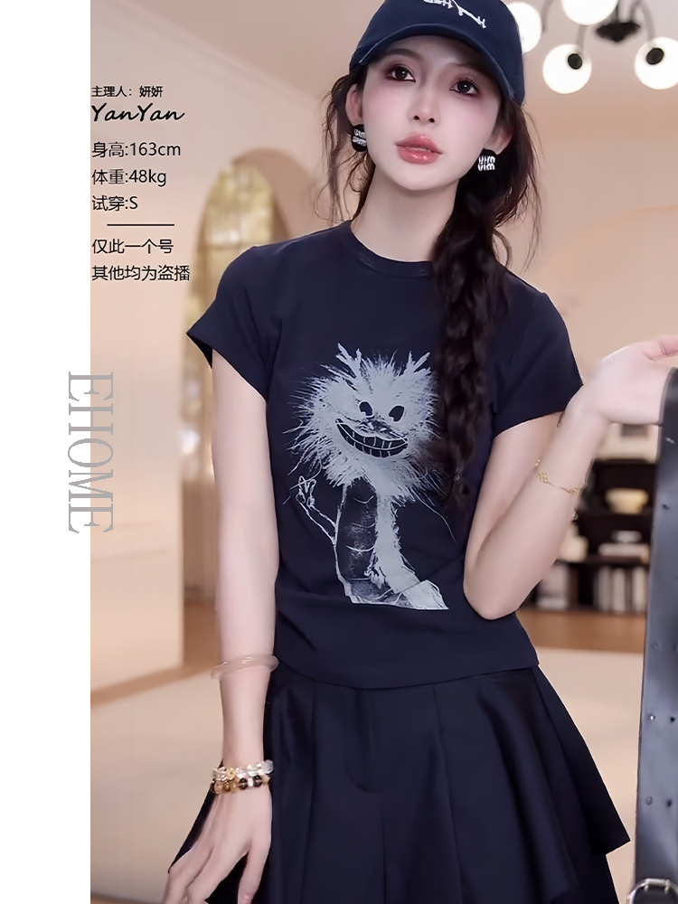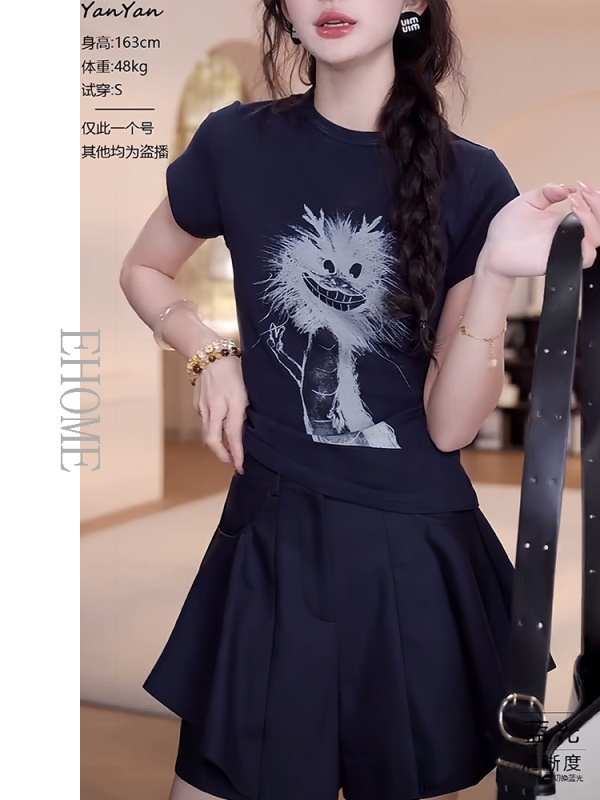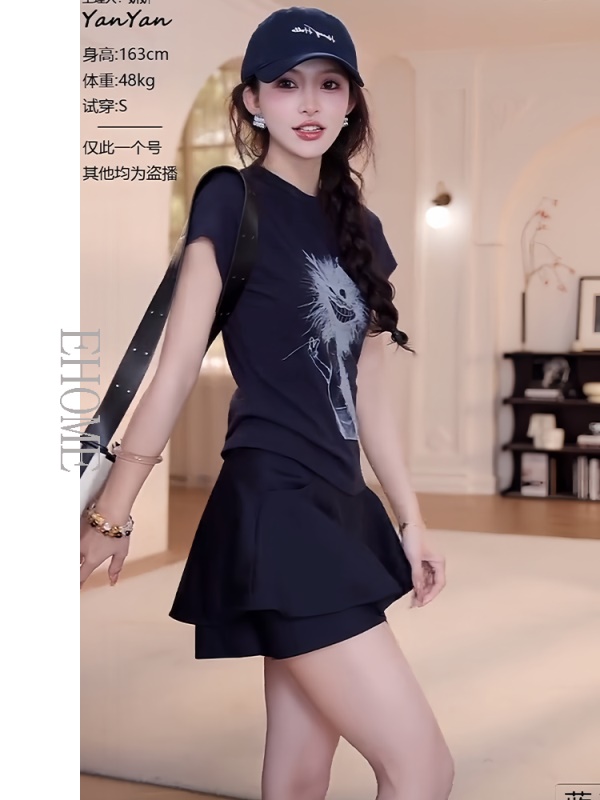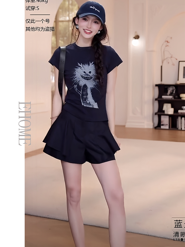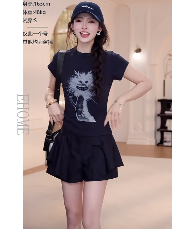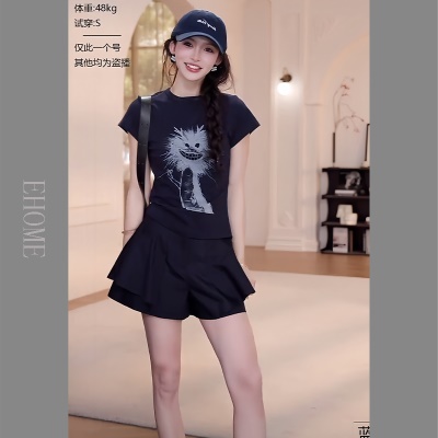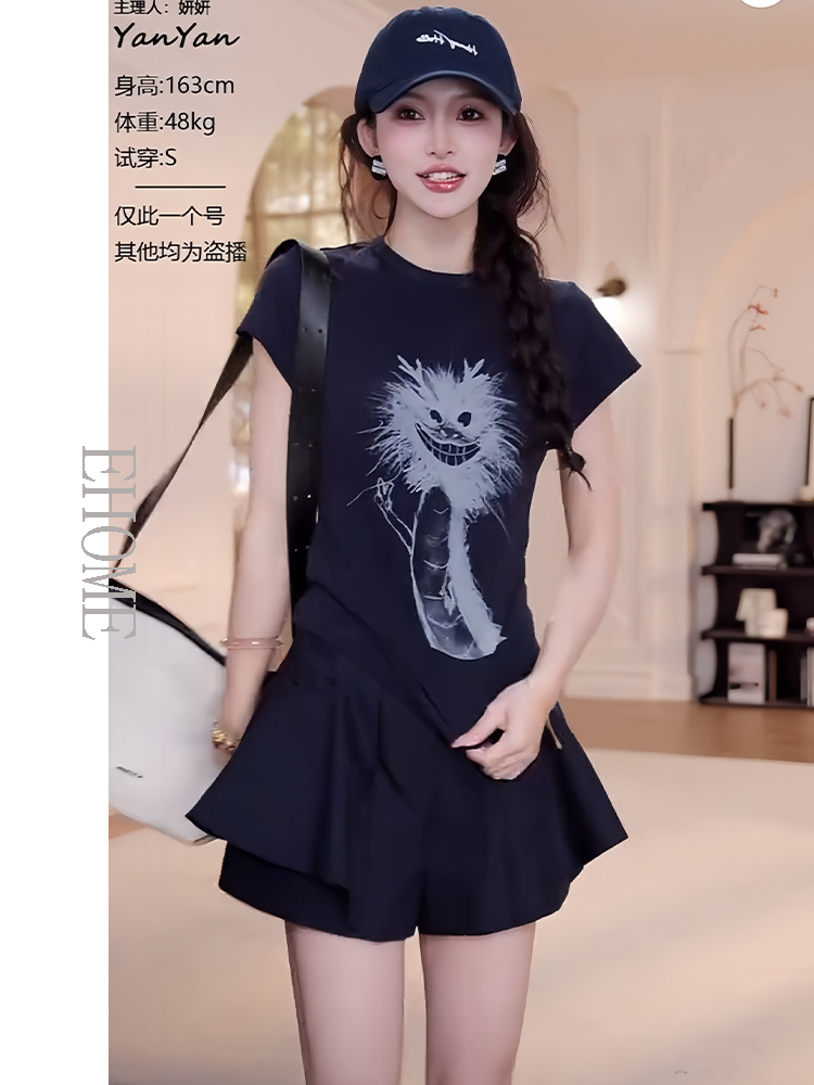 商品名称:夏日漂亮小套装韩系减龄卡通抽象小龙短袖T恤显瘦气质百搭裙裤女