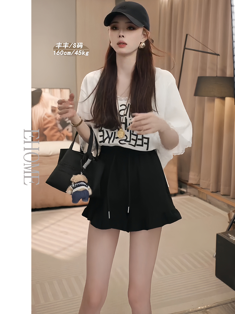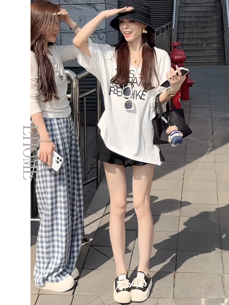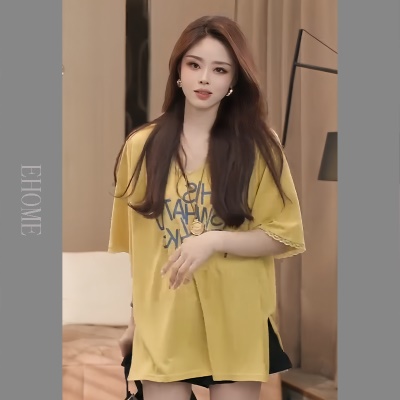 商品名称:2025超火夏装一整套宽松蕾丝拼接五分袖印花宽松圆领T恤裤子套装