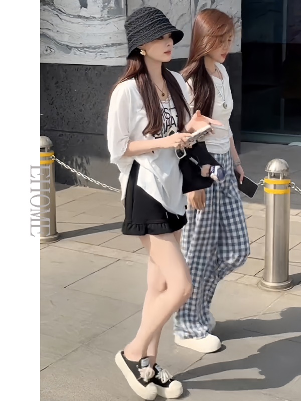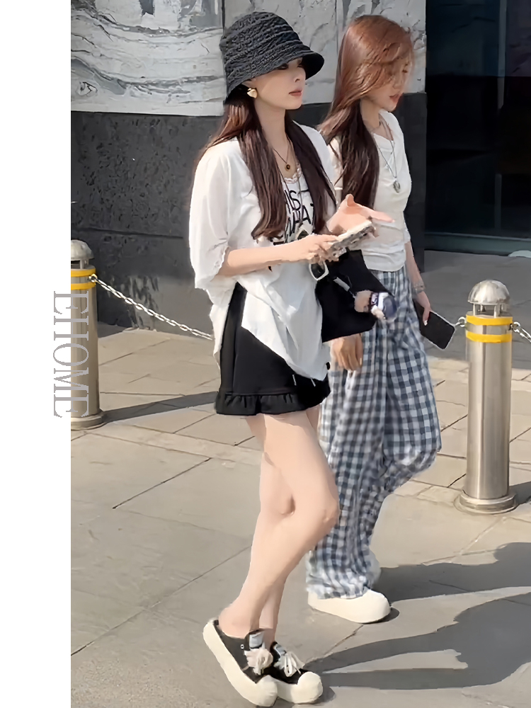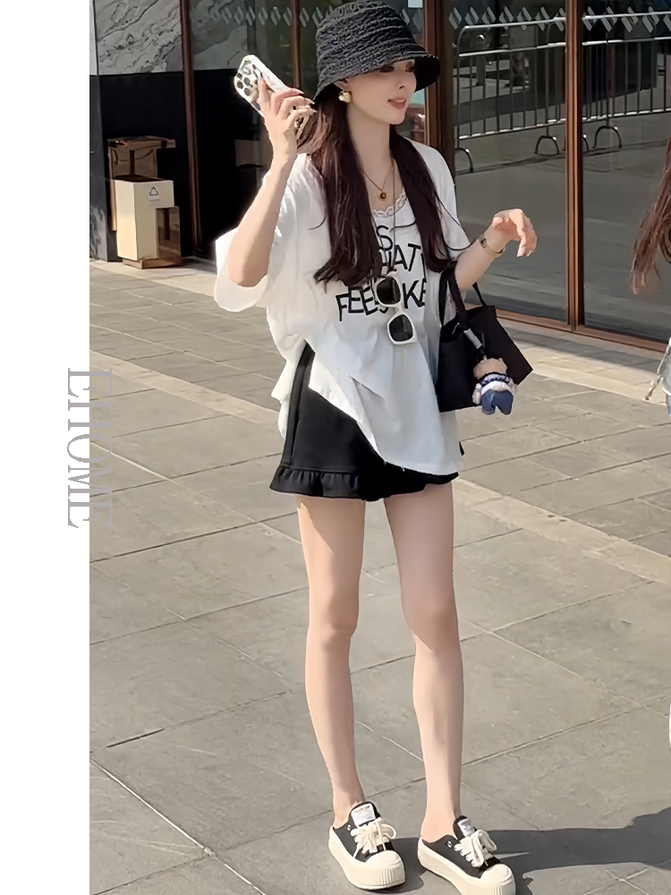 2025超火夏装一整套宽松蕾丝拼接五分袖印花宽松圆领T恤裤子套装