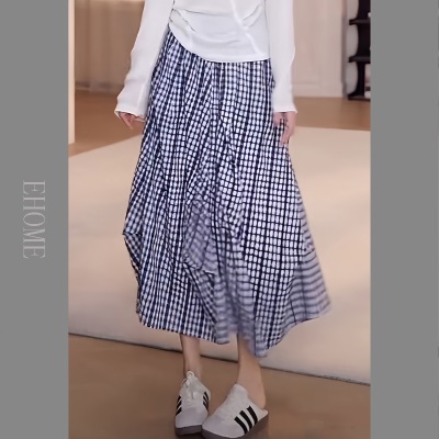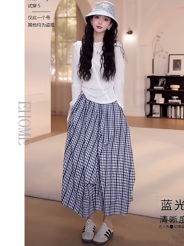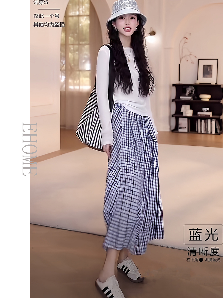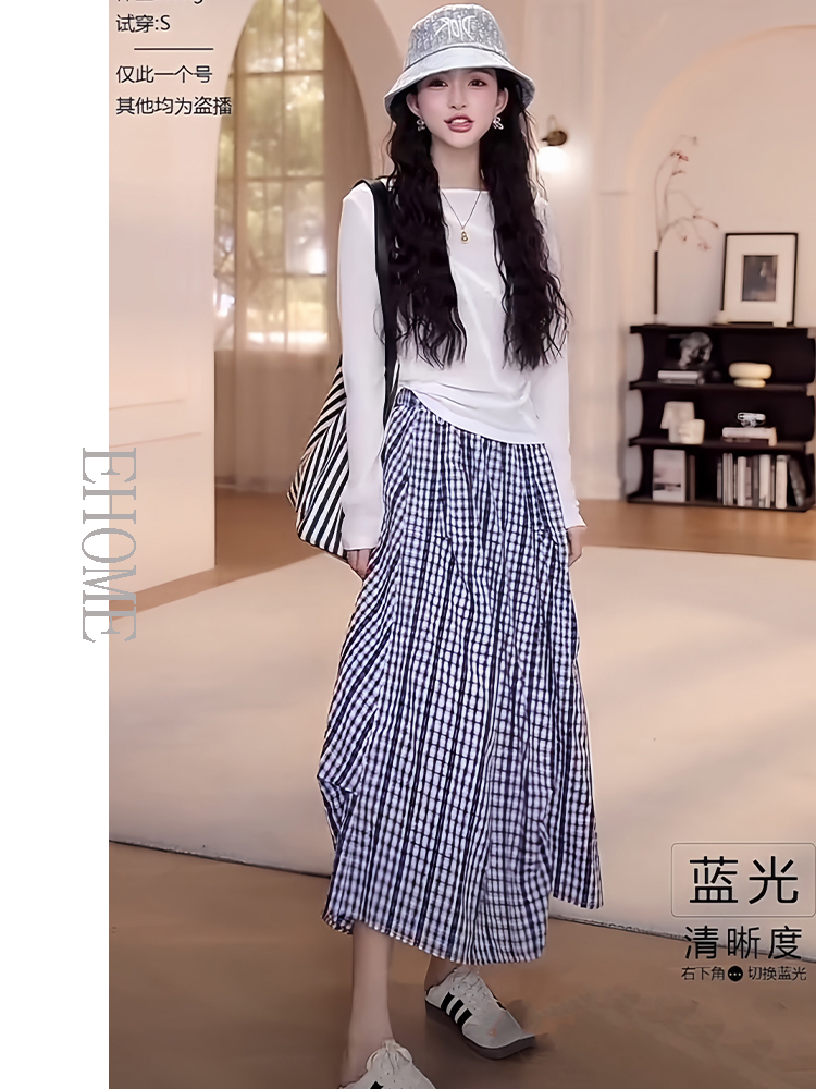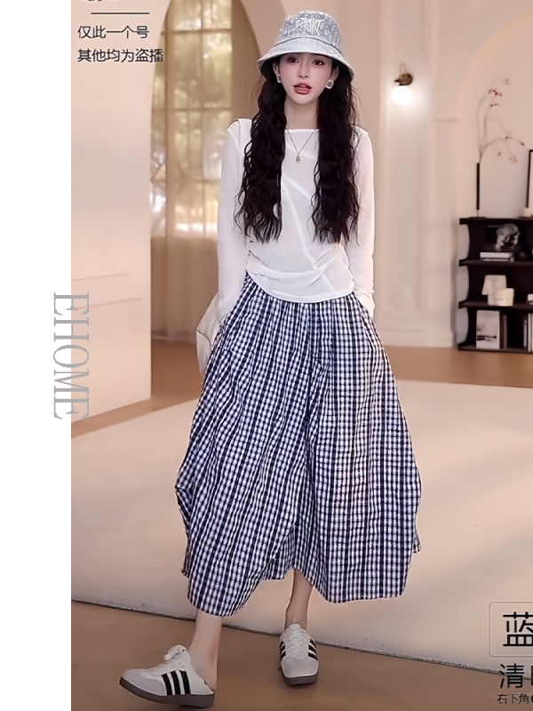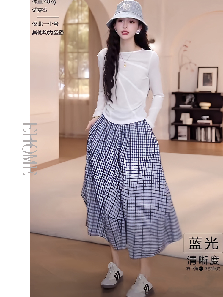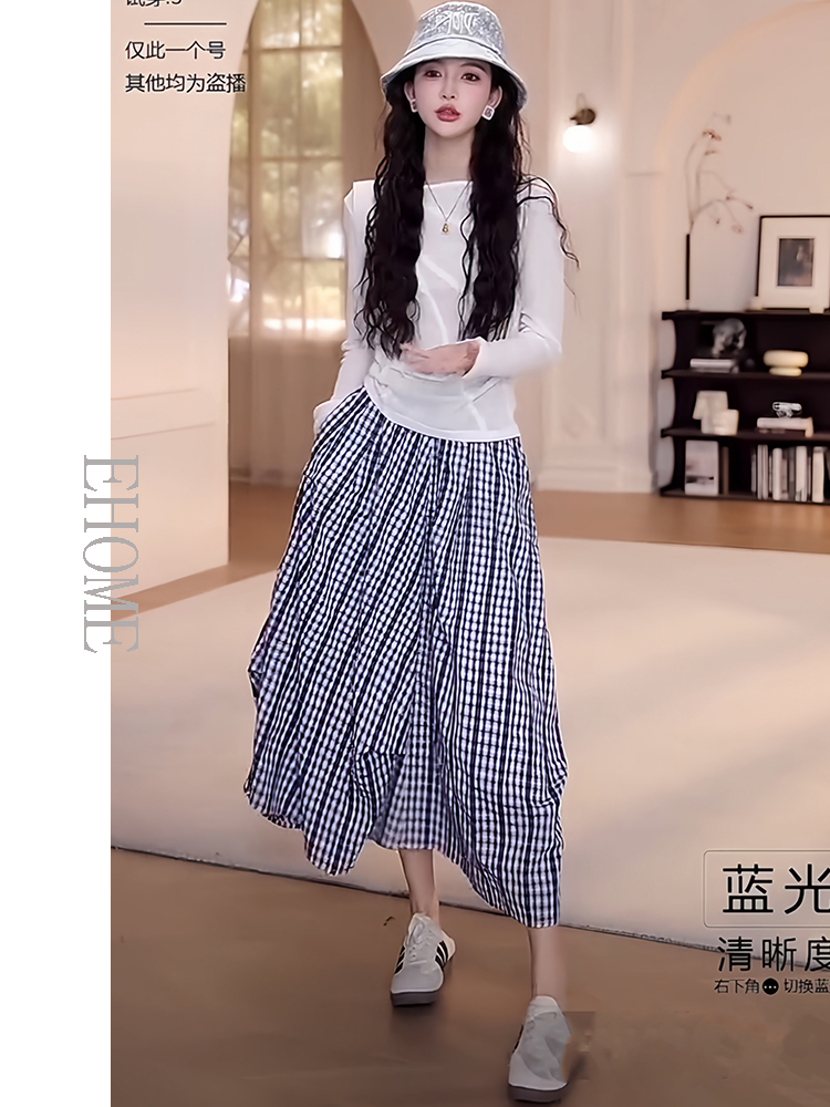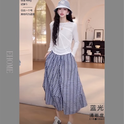 商品名称:清纯系夏日穿搭套装蕾丝花边长袖T恤上衣百搭不规则格子半身裙女