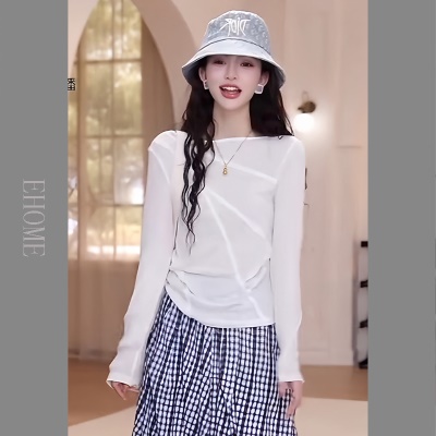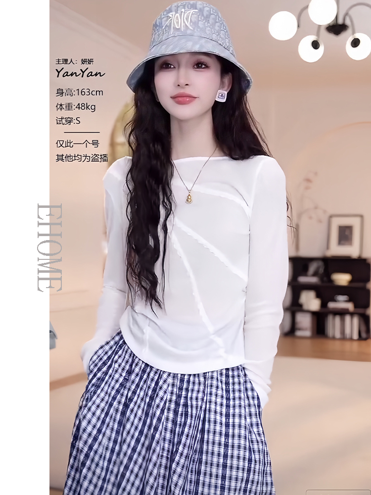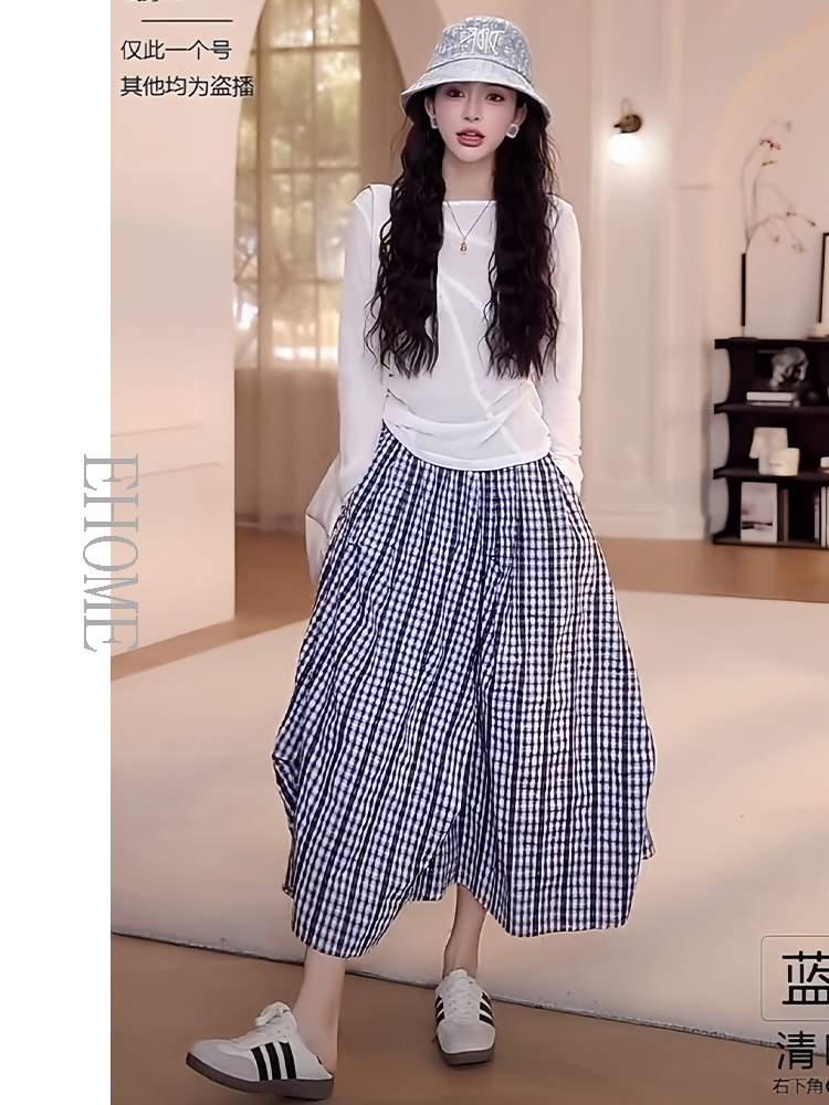 清纯系夏日穿搭套装蕾丝花边长袖T恤上衣百搭不规则格子半身裙女