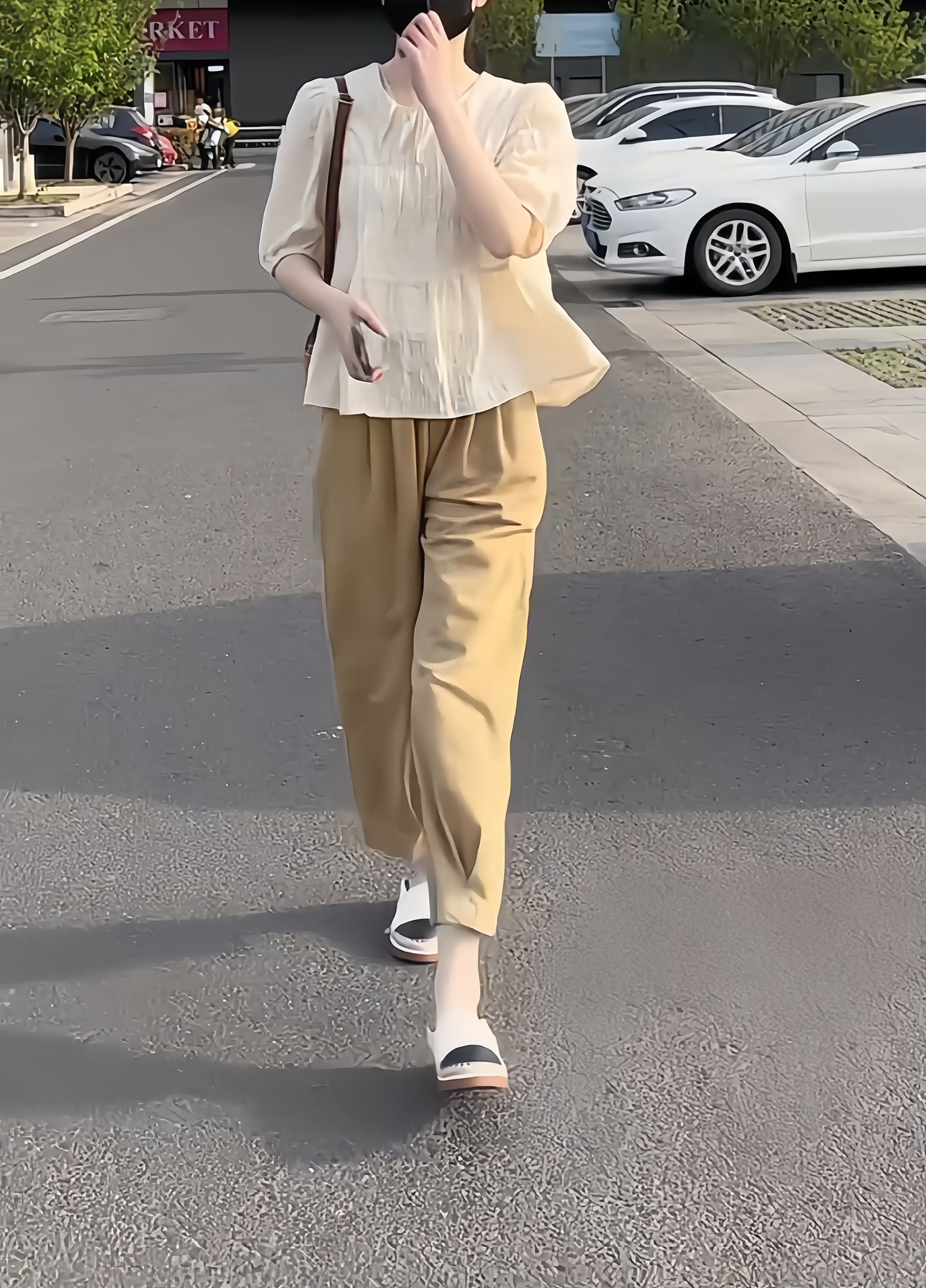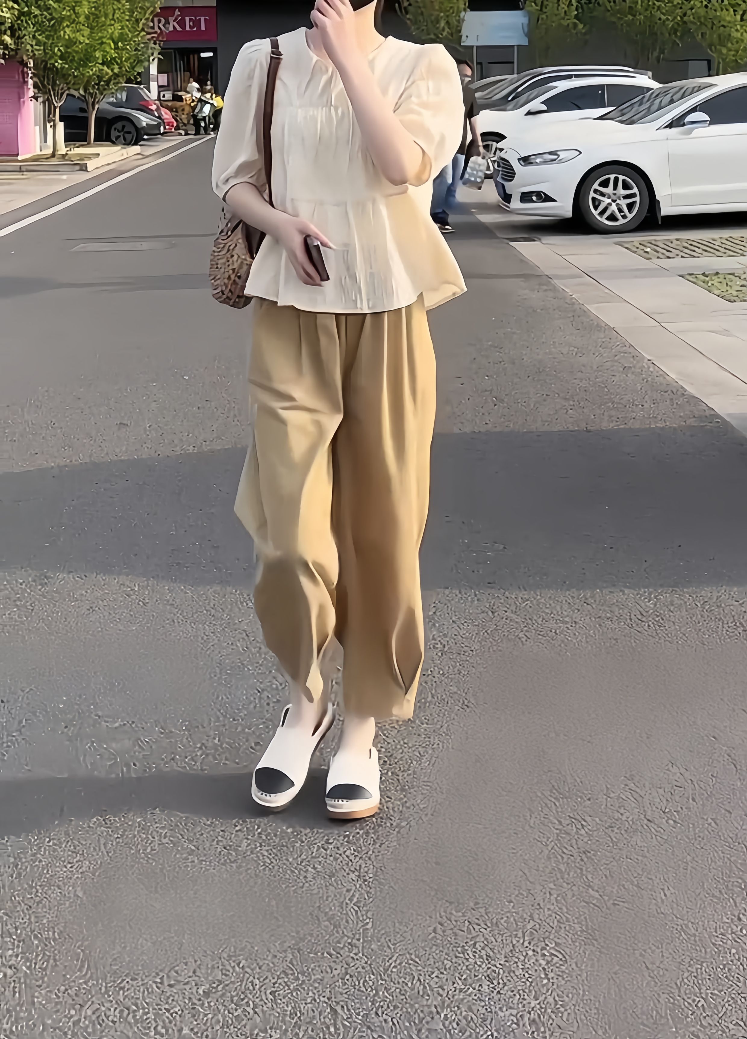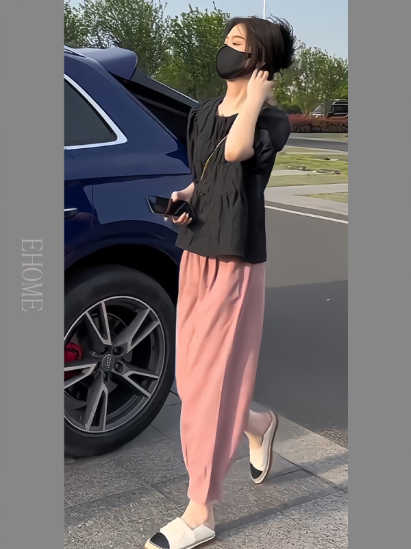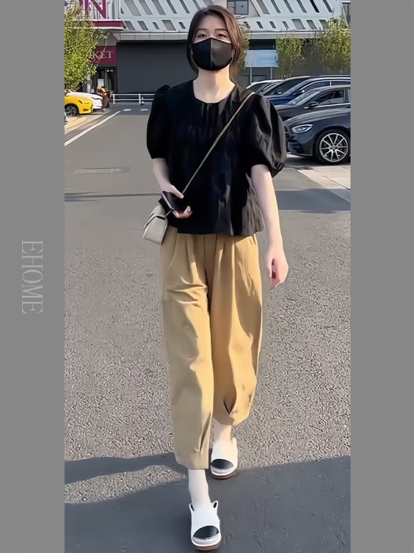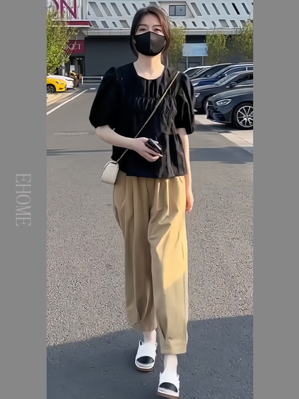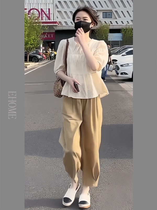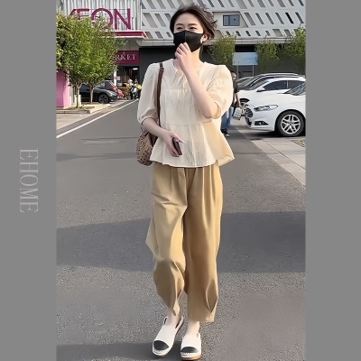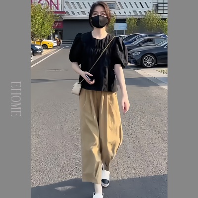 商品名称:夏季梨形身材穿搭盐系减龄轻熟圆领泡泡袖衬衣九分阔腿裤两件套装
