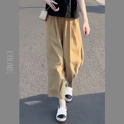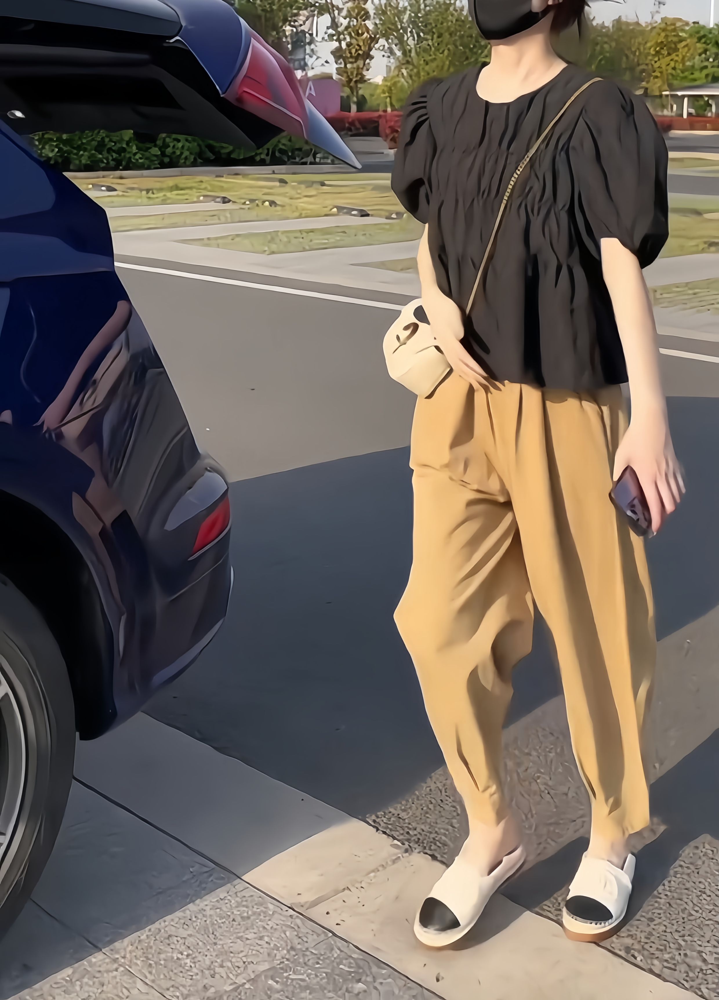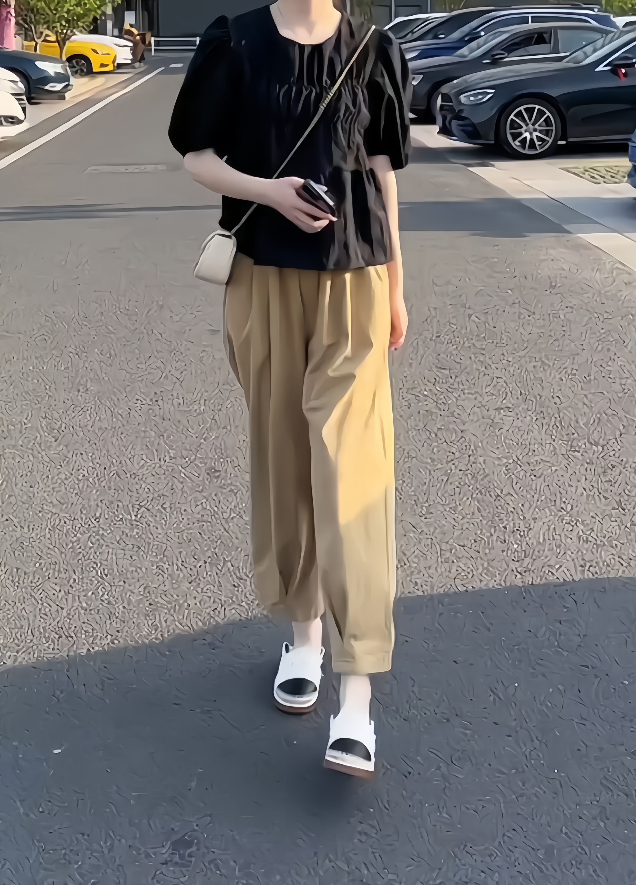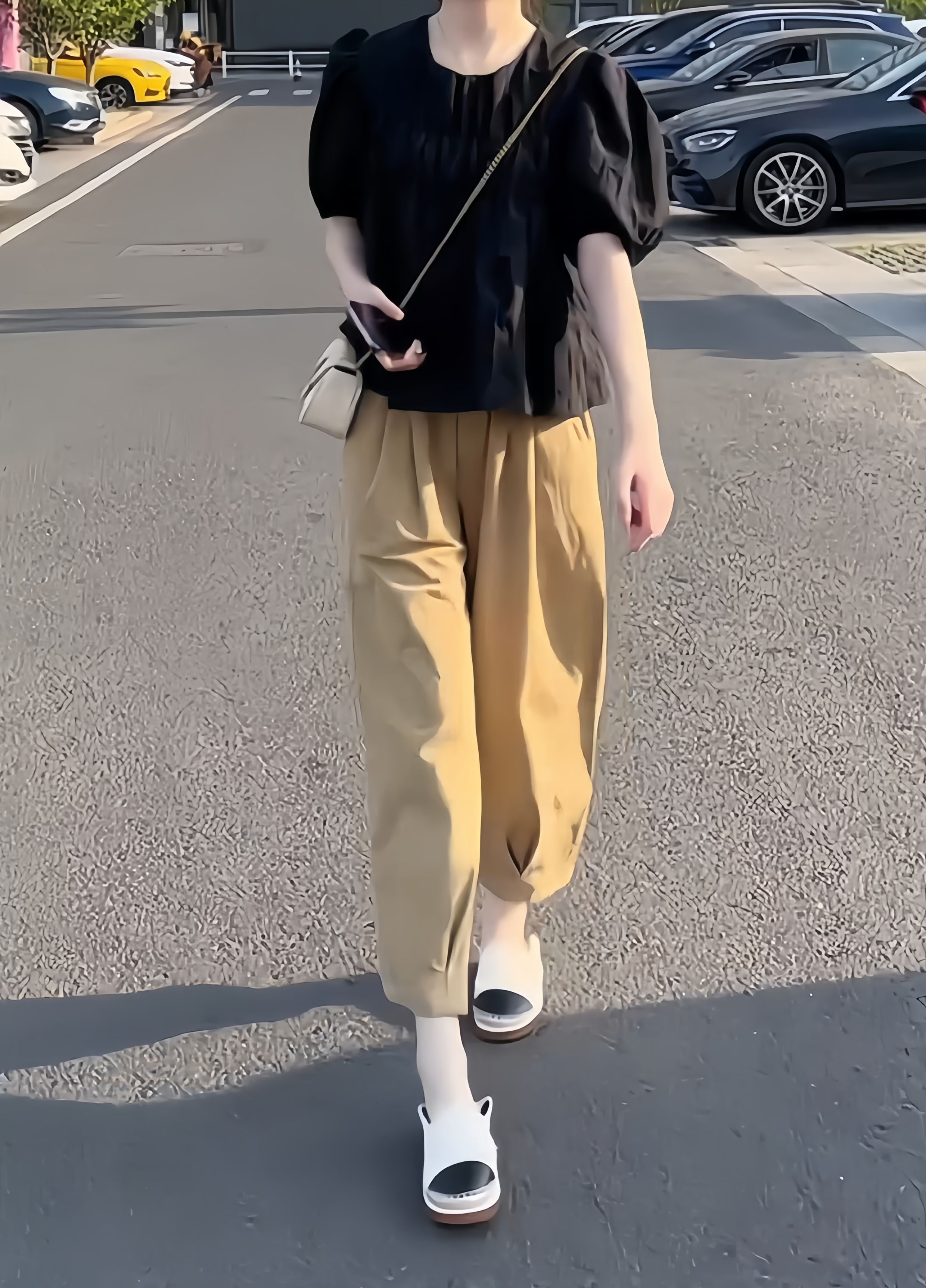 商品名称:夏季梨形身材穿搭盐系减龄轻熟圆领泡泡袖衬衣九分阔腿裤两件套装