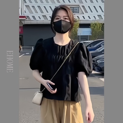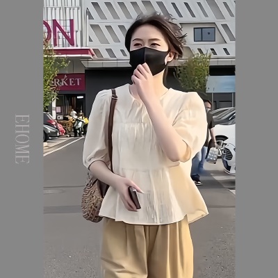 夏季梨形身材穿搭盐系减龄轻熟圆领泡泡袖衬衣九分阔腿裤两件套装