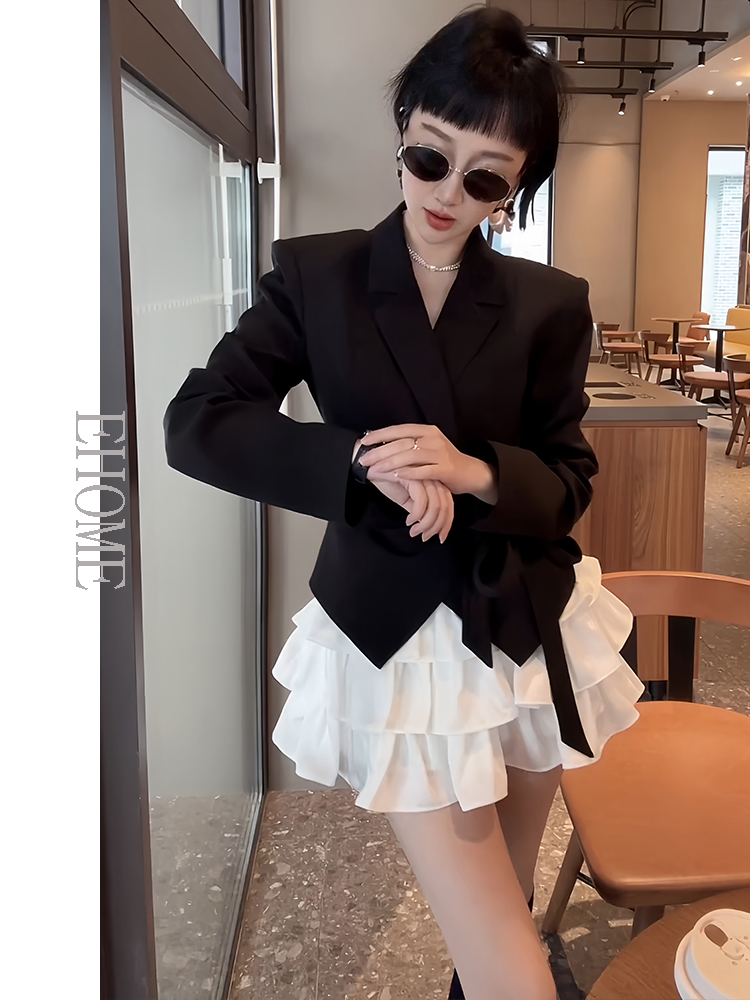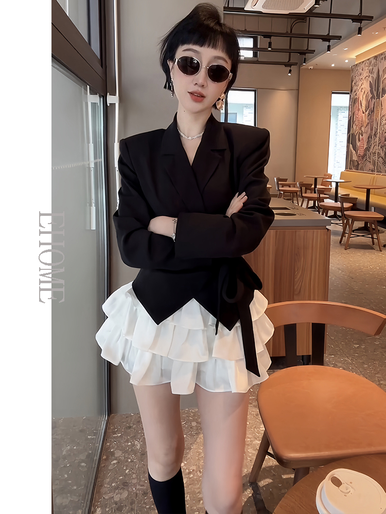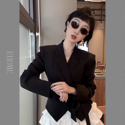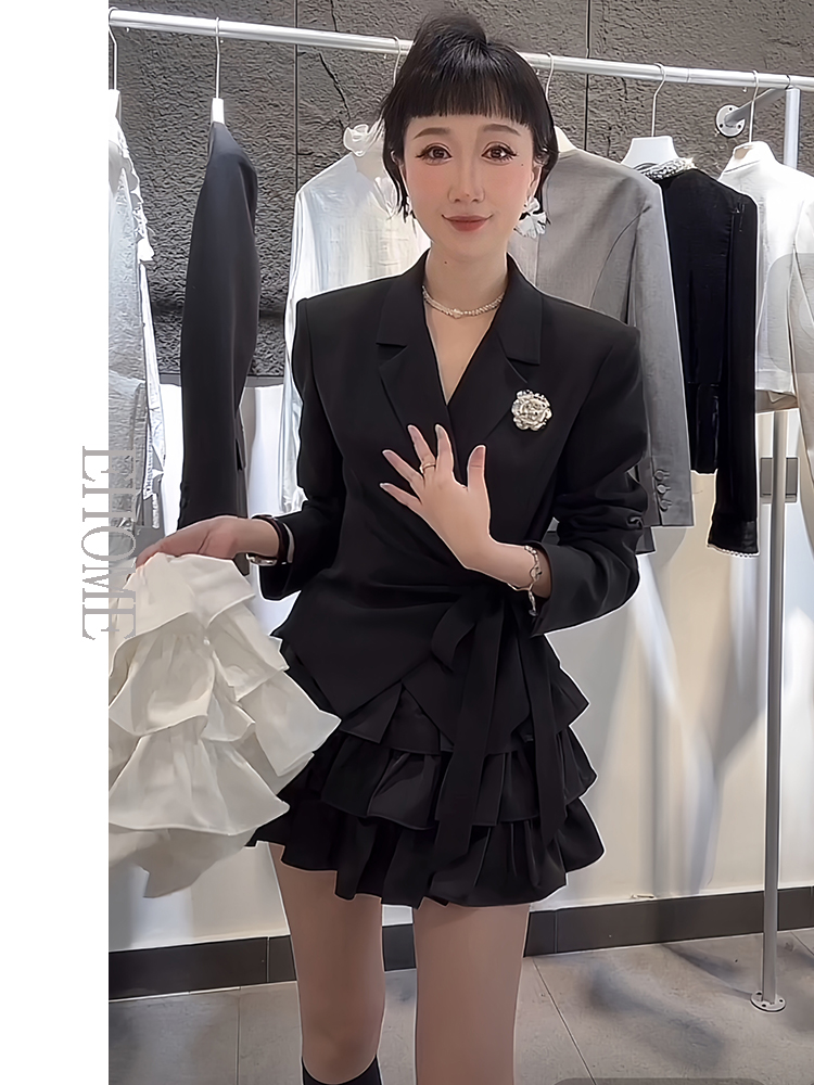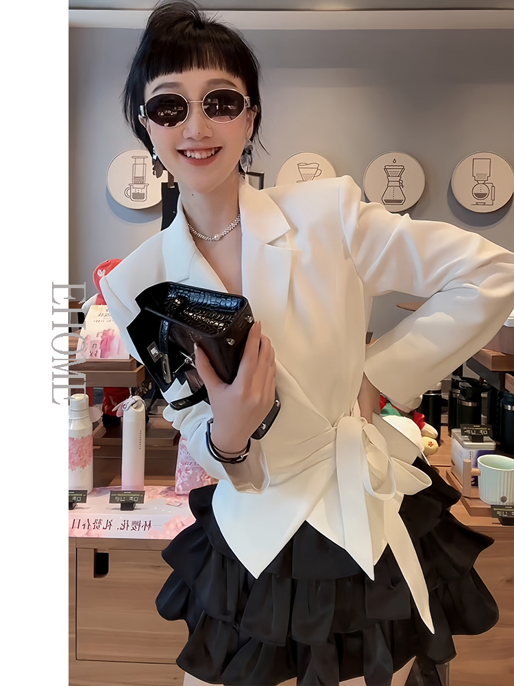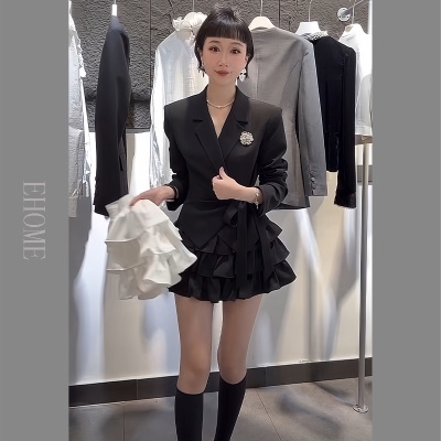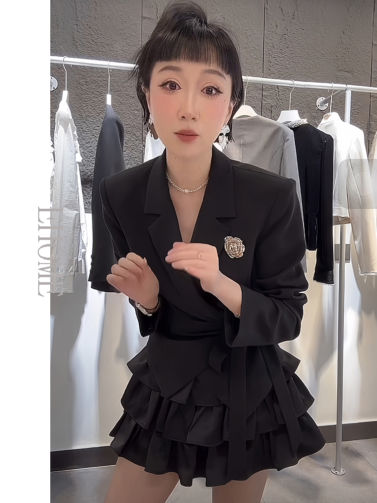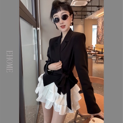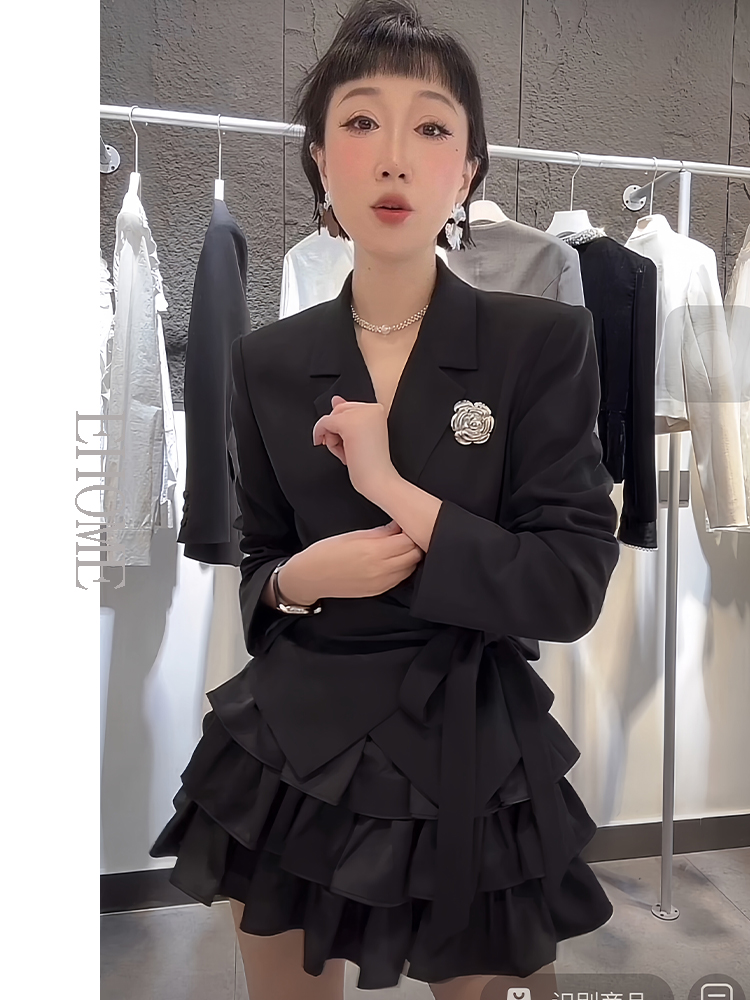 商品名称:绝美开春小套装名媛气质短款系腰带V领西装外套百搭时尚蛋糕裙裤