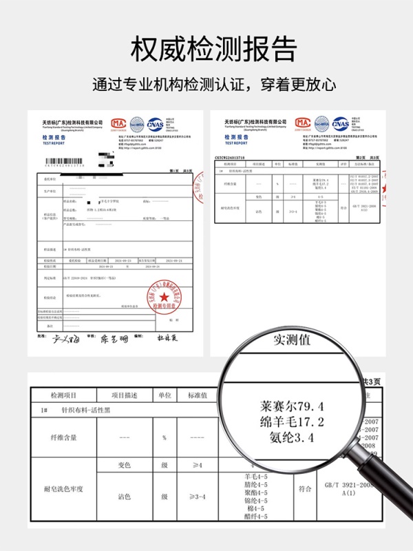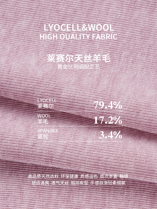 材质成分:莱赛尔纤维(莱赛尔)79.4% 羊毛17.2% 聚氨酯弹性纤维(氨纶)3.4%